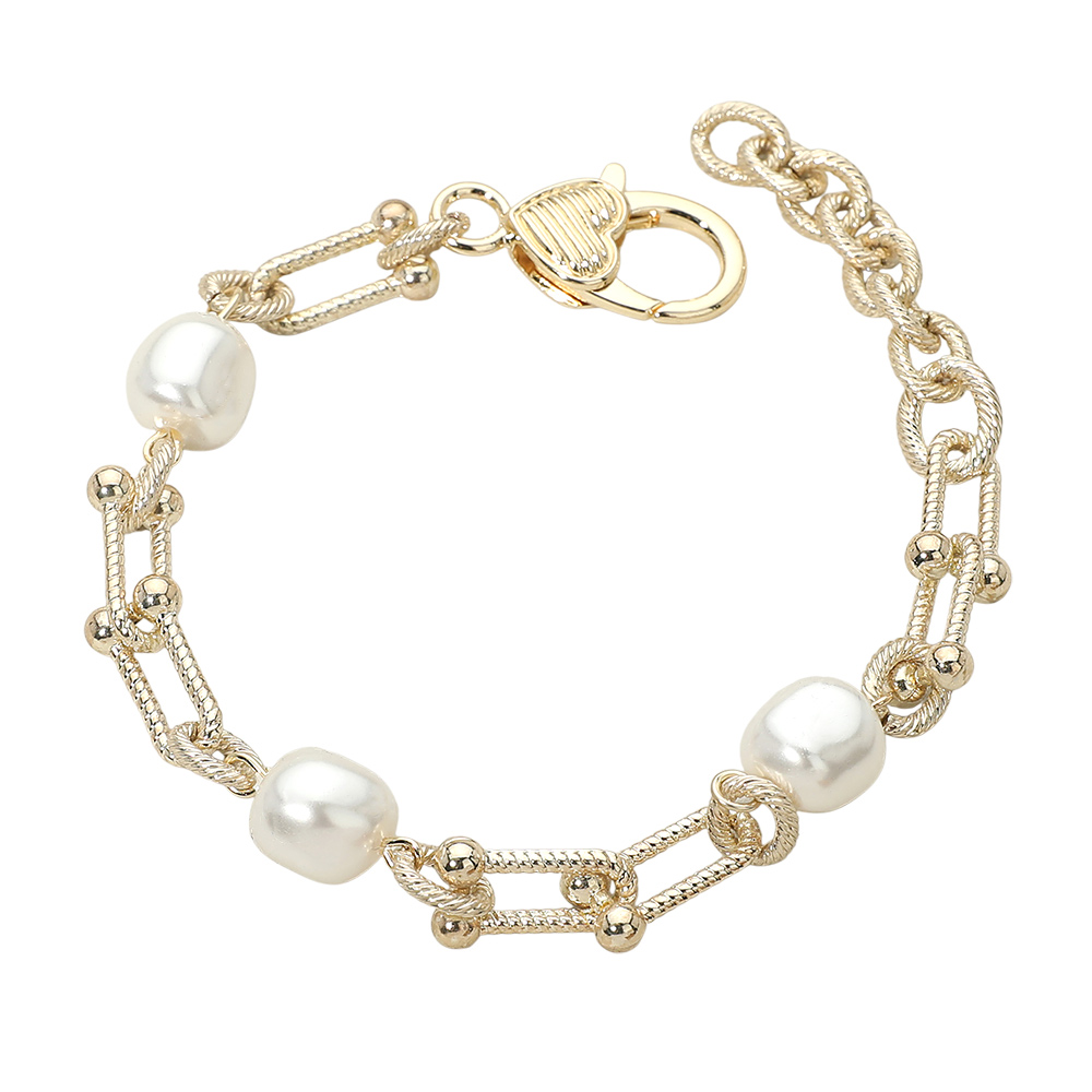 14K Gold Plated Pearl Accent Textured Industrial Link Chain Bracelet 14K Gold Plated Pearl Accent Textured Industrial Link Chain Bracelet