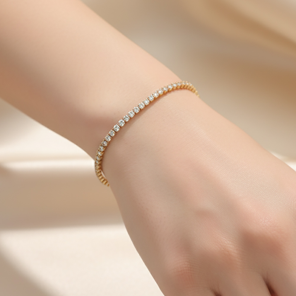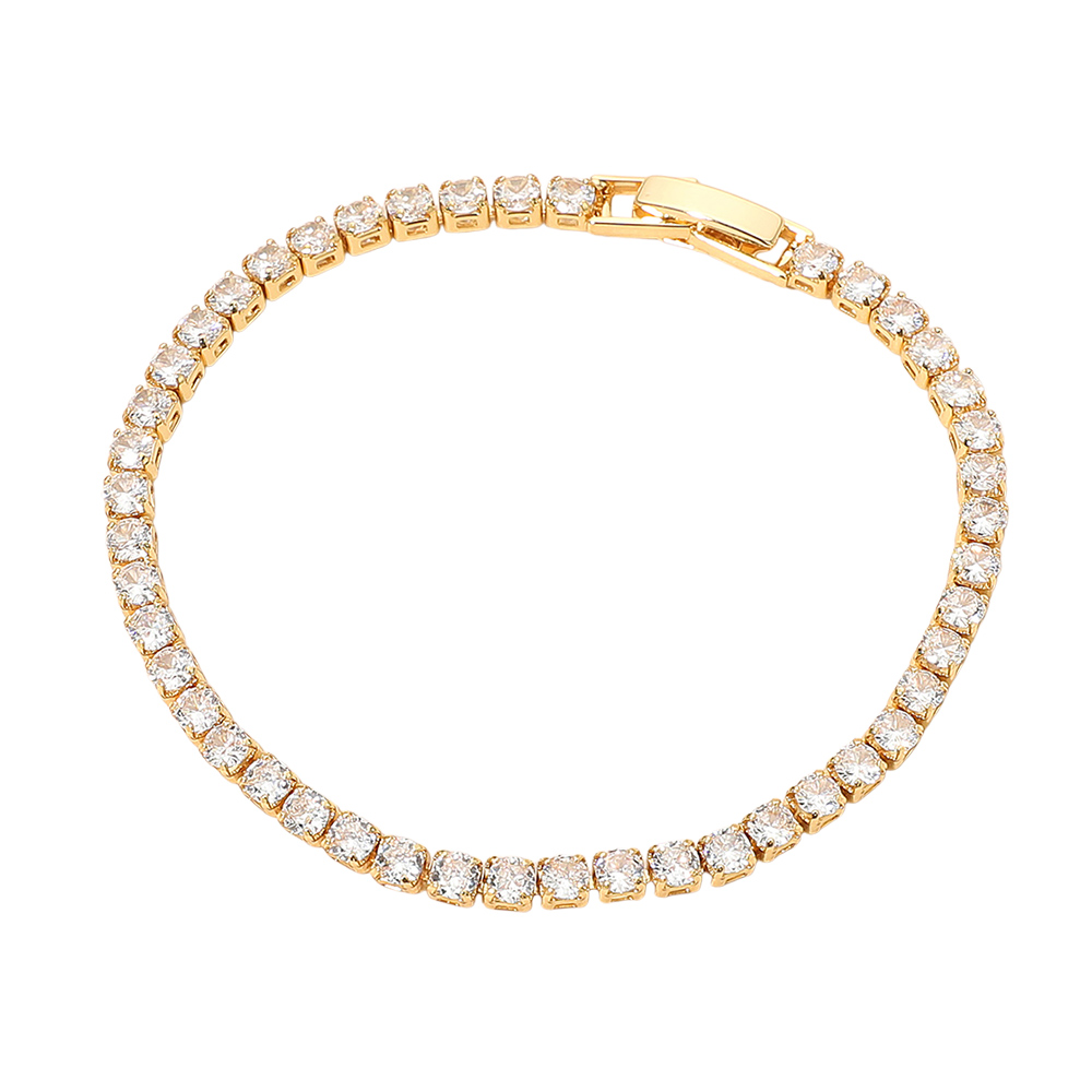 Details • Size : 0.1" H, 6.5" + 1" L • Fold Over Closure • Sophisticated tennis bracelet showcasing a continuous line of radiant round stones for timeless sparkle. Featuring a secure clasp and polished finish, this bracelet adds classic charm to any ensemble, perfect for evening wear, formal events, or refined everyday elegance. • Gold Dipped • Lead and Nickel Compliant
