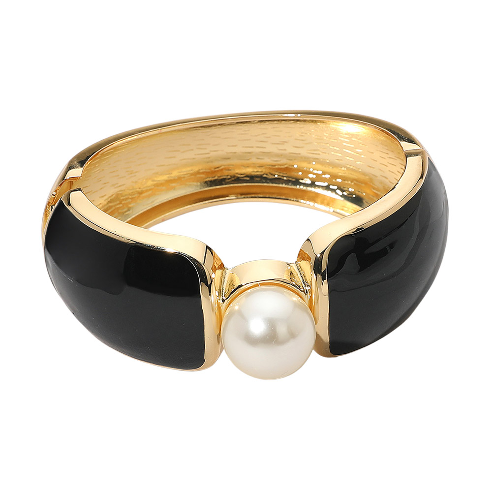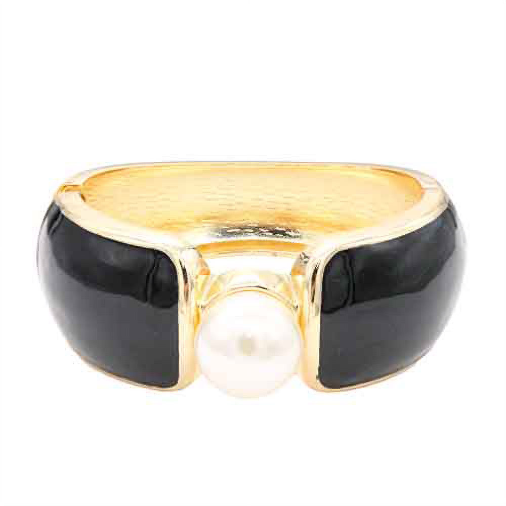 • Chic wide cuff bracelet featuring a smooth enamel finish and bold central pearl accent for a sophisticated look. Perfect for adding elegance to any outfit, this statement piece offers a modern twist with a secure hinged closure and polished finish ideal for day or evening wear.