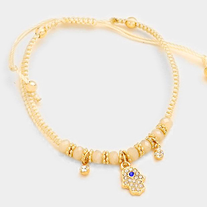 Crystal Paved Evil Eye Hamsa Hand Charm Beaded Adjustable Cinch Pull Tie Bracelet