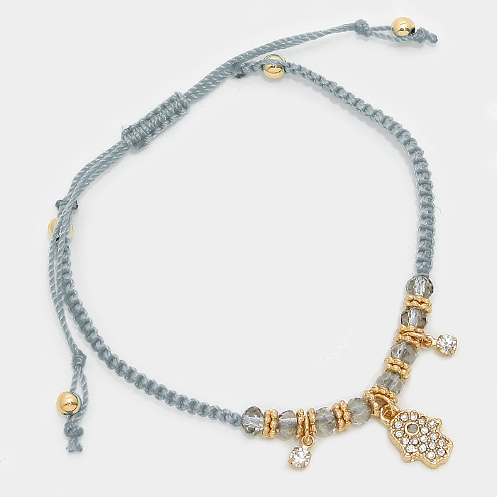 Crystal Paved Evil Eye Hamsa Hand Charm Beaded Adjustable Cinch Pull Tie Bracelet
