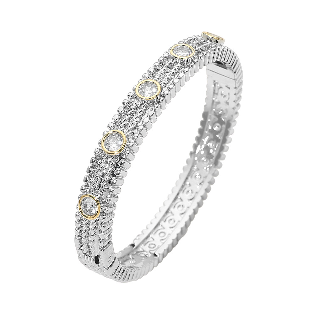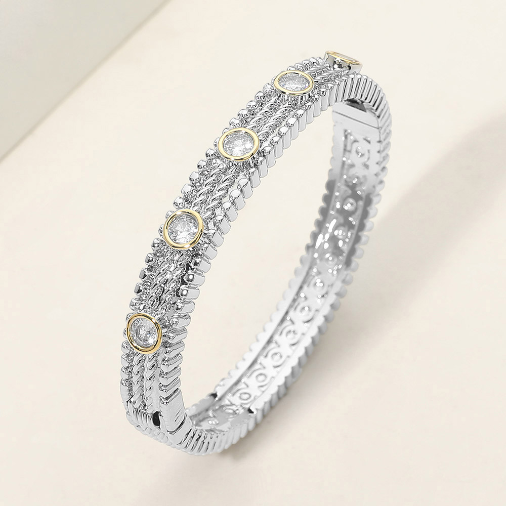 Details • Size : 0.3" H, 2.4" D • Hinged Closure • This statement hinged bangle bracelet features a detailed textured band accented with evenly spaced bezel-style elements for a refined, modern look. Designed for comfortable slip-on wear, it adds structure and visual interest to both casual and dressy outfits, making it a versatile addition for curated jewelry collections or gift-ready displays. • CZ Cubic Zirconia