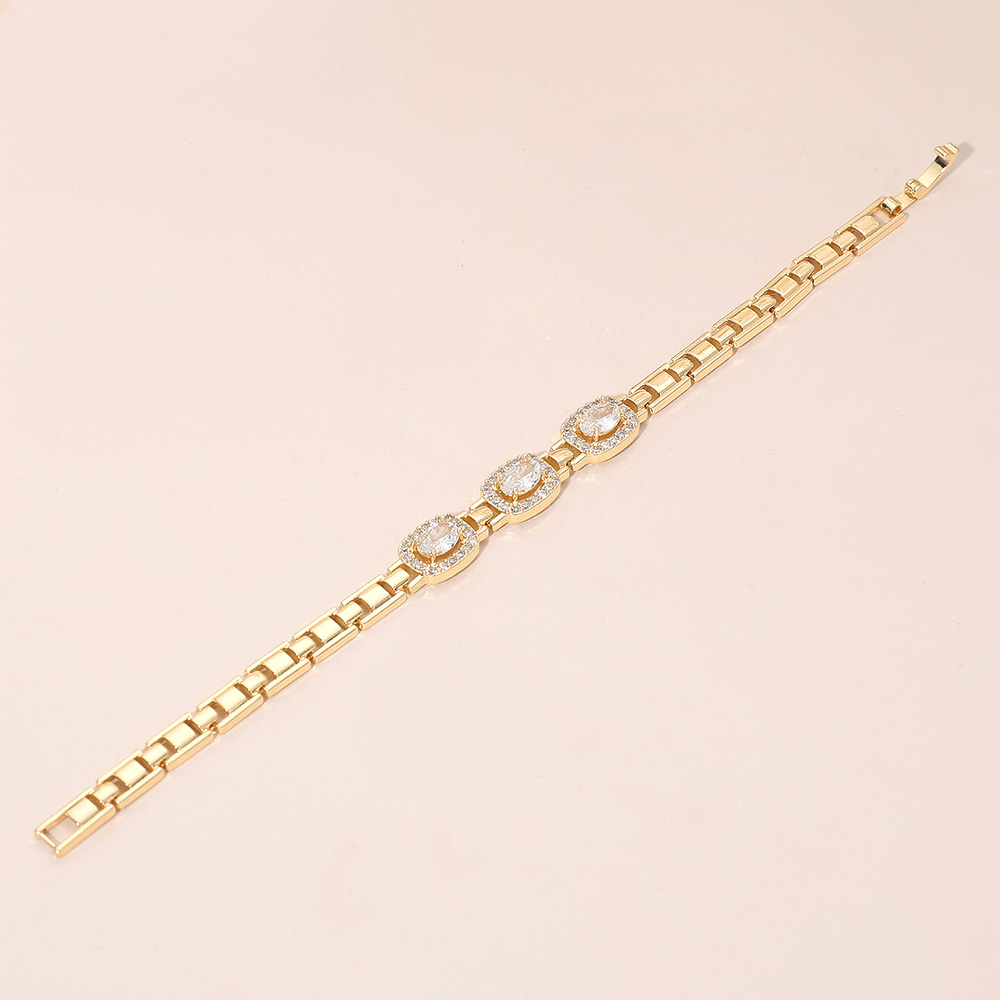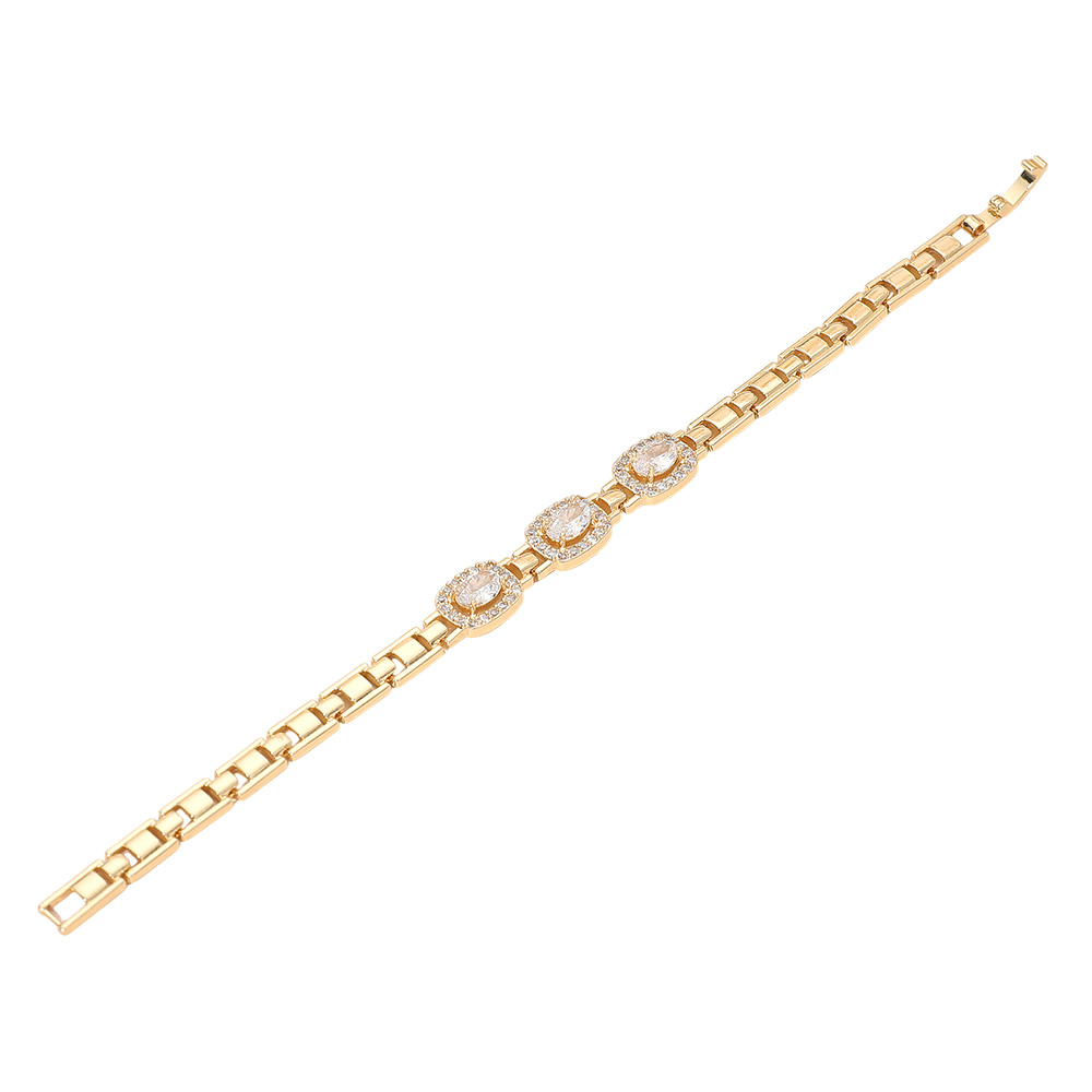 Details • Size : 0.4" H, 7" + 0.5" L • Fold Over Closure • Sophisticated bracelet featuring three oval cut crystal links framed by sparkling stones. Its timeless and elegant design adds a touch of glamour to any outfit, perfect for formal events or daily wear, making it a refined accessory for every jewelry collection. • Brass • CZ Cubic Zirconia