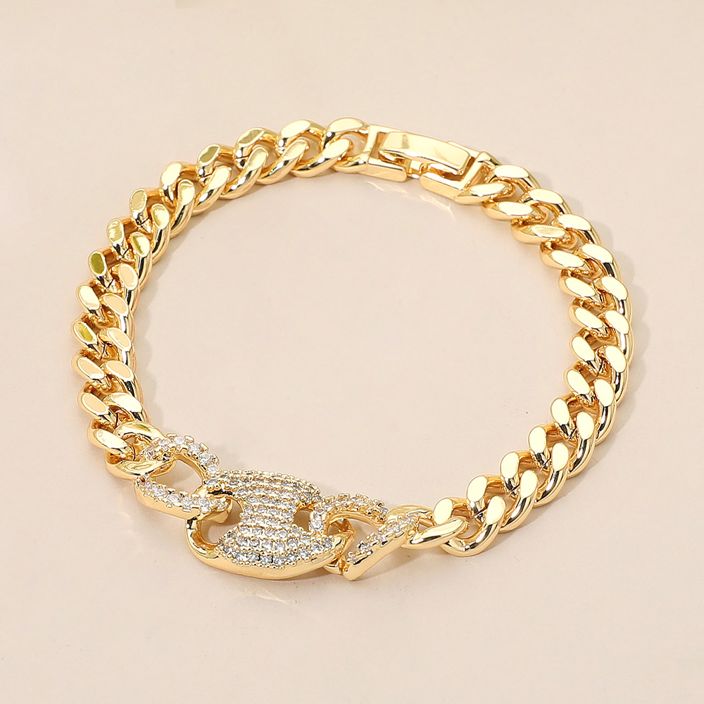 Details • Size : 0.6" H, 7.25" + 0.3" L • Fold Over Closure • Stylish Cuban link bracelet featuring a polished chain design with a sparkling clasp accent. Perfect for both casual and formal wear, this bracelet offers timeless appeal with a touch of glamour. A versatile accessory that enhances your jewelry collection with bold and elegant style. • Brass • CZ Cubic Zirconia • Lead and Nickel Compliant