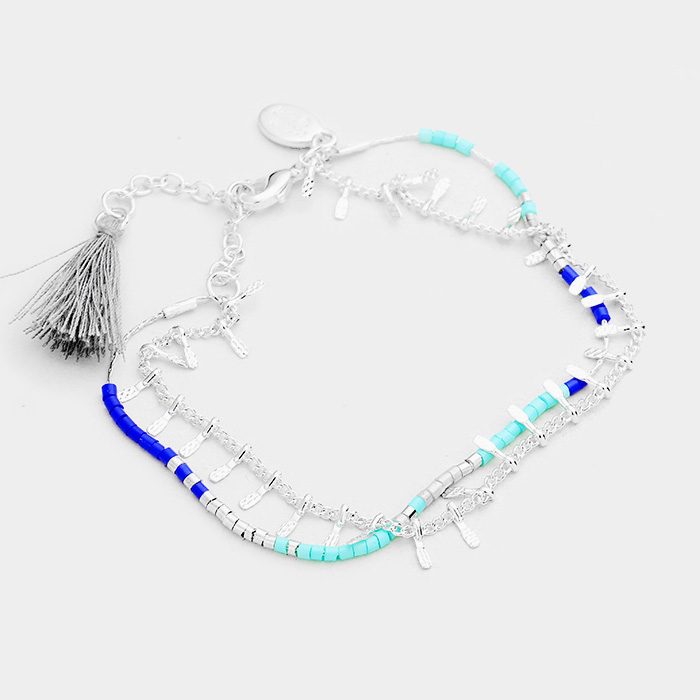 Double Strand Beaded Tiny Metal Bar Fringe Tassel Bracelet