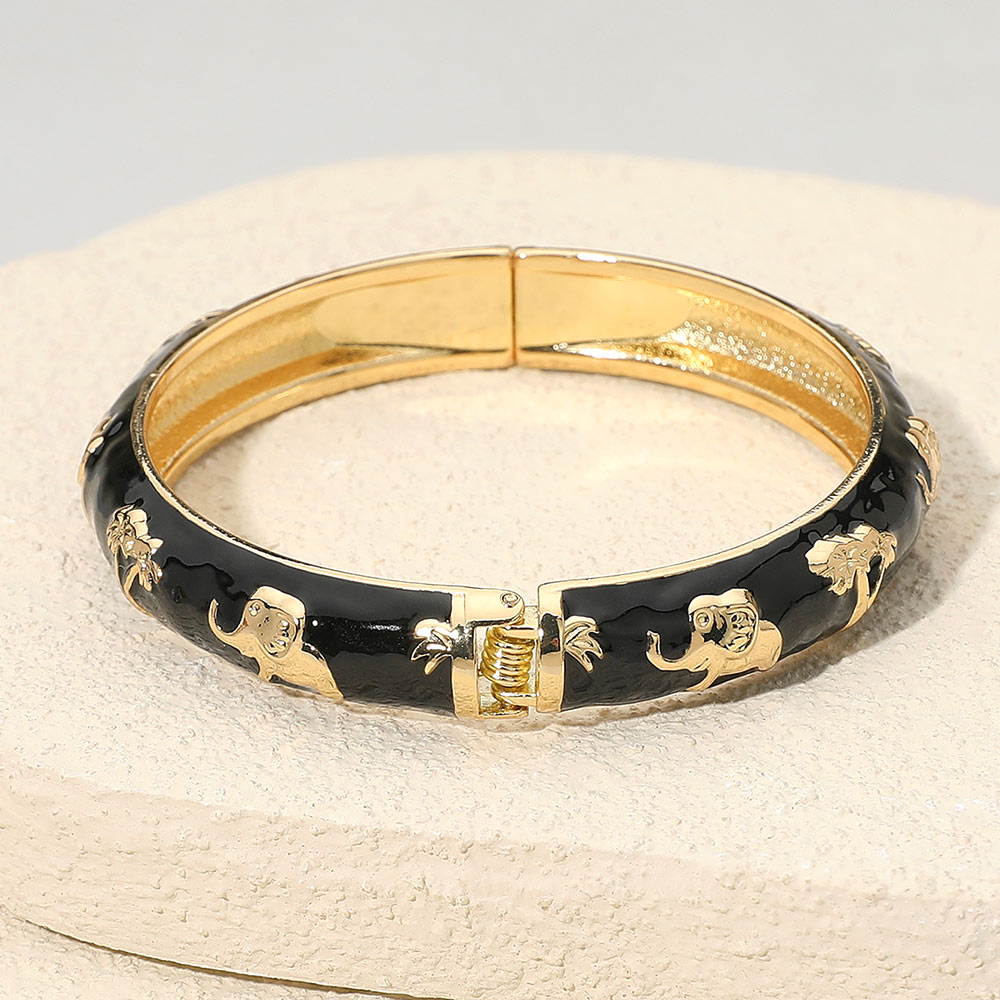 • Elegant hinged bangle bracelet featuring embossed elephant and tree motifs for a touch of exotic charm. The smooth enamel finish and polished edges create a refined look, making it a perfect accessory to complement everyday outfits or add flair to special occasion styles.