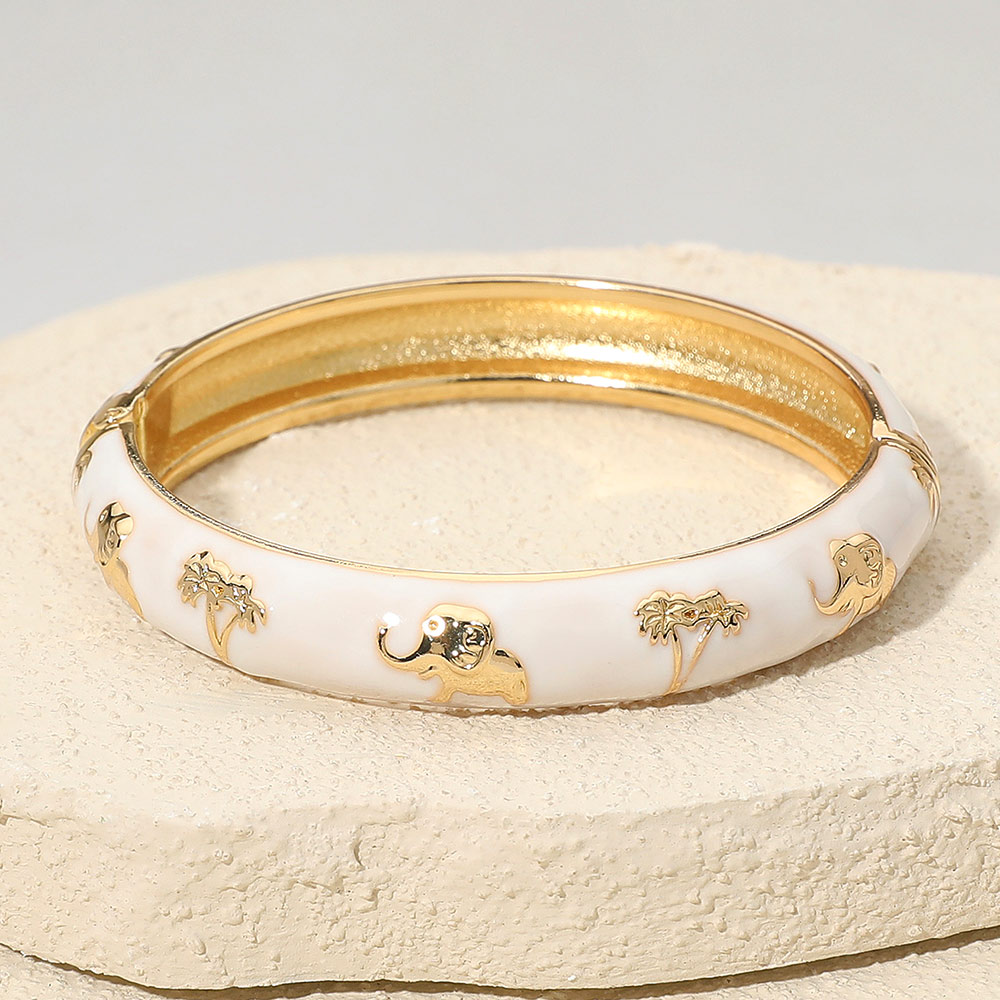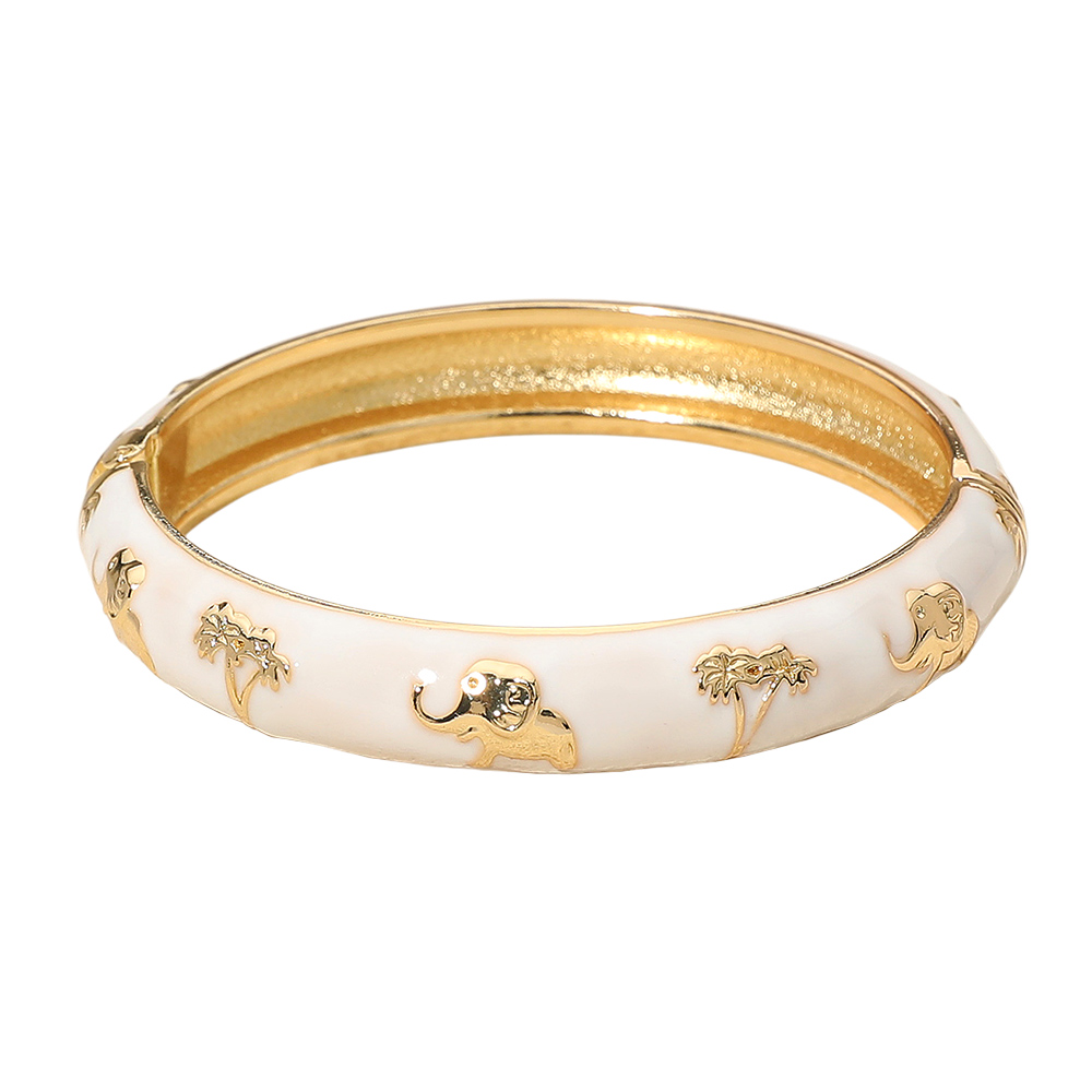 • Elegant hinged bangle bracelet featuring embossed elephant and tree motifs for a touch of exotic charm. The smooth enamel finish and polished edges create a refined look, making it a perfect accessory to complement everyday outfits or add flair to special occasion styles.