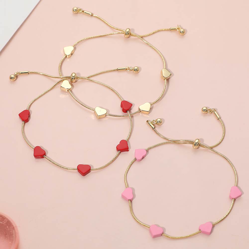 Details • Size : 0.25" H • Adjustable • Minimal adjustable bracelet featuring smooth heart station accents spaced along a sleek slider chain. Designed for easy sizing and all-day comfort, this bracelet delivers a clean, romantic look that works for everyday wear, layering, or gifting. A versatile style ideal for boutiques, curated collections, and modern jewelry displays. • Lead and Nickel Compliant