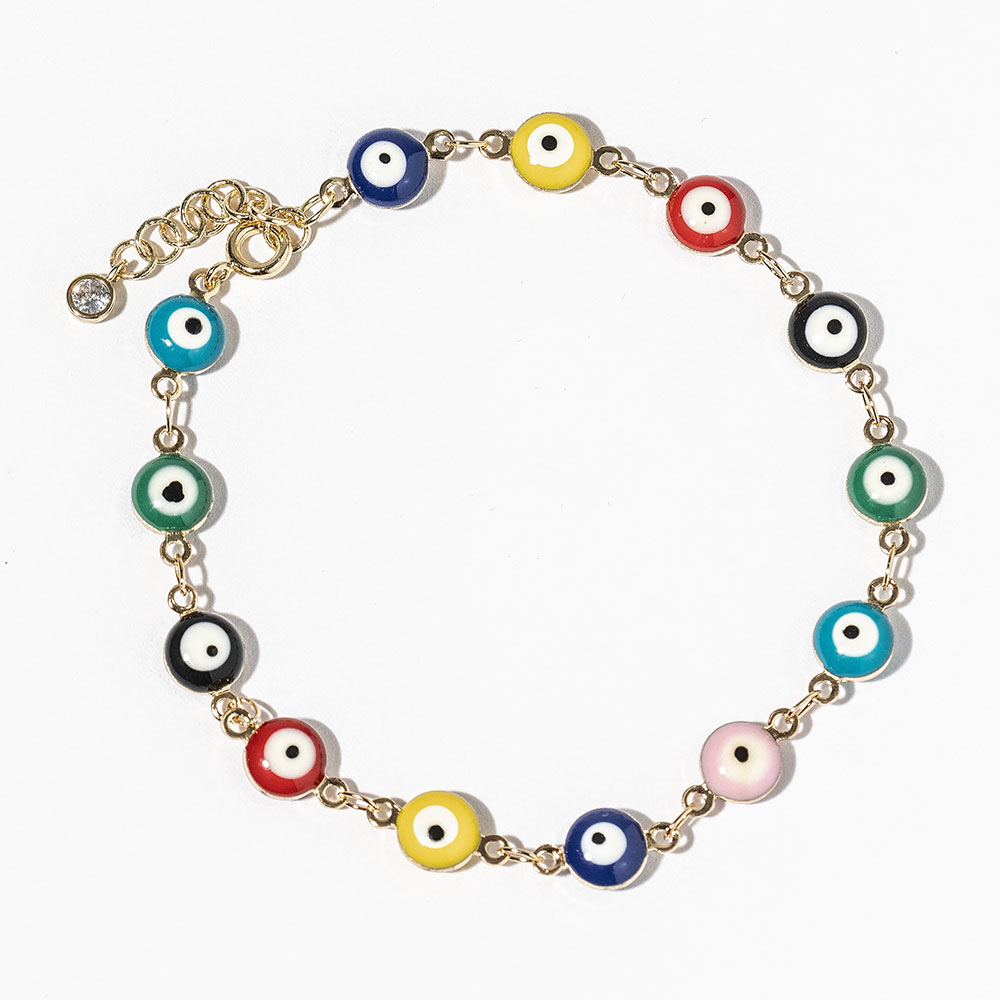 • Playful evil eye link bracelet designed with a series of round charms symbolizing protection and positivity. A chic, lightweight accessory that adds a touch of color and meaning to your look, perfect for layering or wearing solo as a trendy everyday good luck piece.