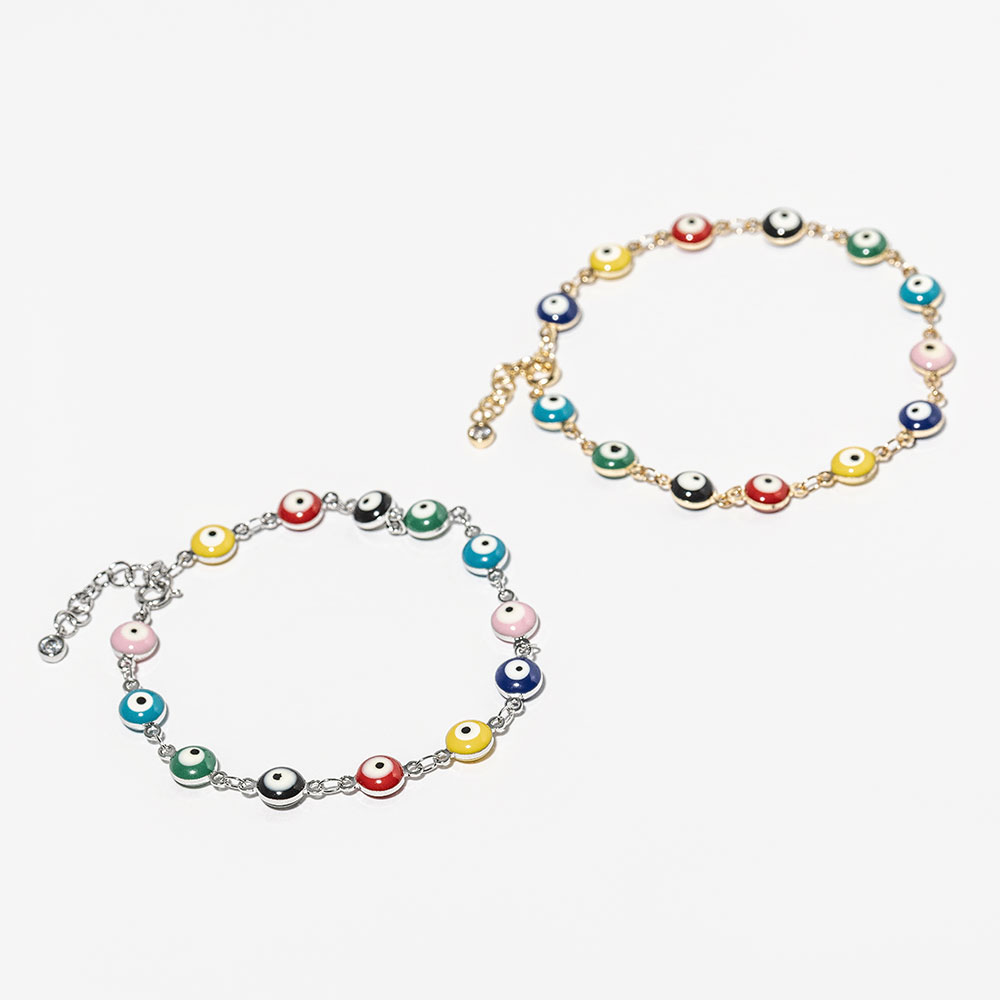 • Playful evil eye link bracelet designed with a series of round charms symbolizing protection and positivity. A chic, lightweight accessory that adds a touch of color and meaning to your look, perfect for layering or wearing solo as a trendy everyday good luck piece.