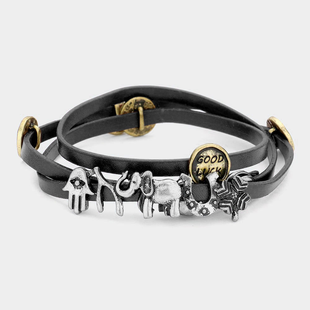 Message Disc Cluster Evil Eye Hamsa Hand & Elephant Faux Leather Wrap Bracelet