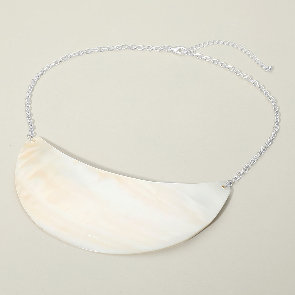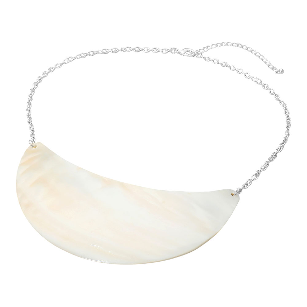 Details • Necklace Size : 20" + 3.5" L • Decor Size : 2.25" L • This curved statement pendant necklace features a smooth, sculptural centerpiece suspended from a classic chain for a clean, modern look. Designed to sit comfortably at the neckline, it adds bold visual impact while remaining easy to style, making it ideal for boutiques seeking standout yet versatile statement jewelry. • Lead and Nickel Compliant