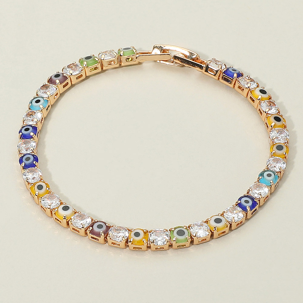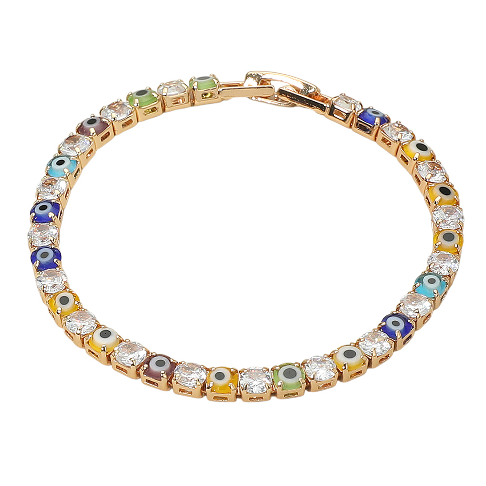 Details • Size : 0.1" H, 6.5" L • Fold Over Closure • Brighten your style with this gold bracelet adorned with multicolor evil eye charms and sparkling crystal accents. Designed to bring both fashion and protection, it’s perfect for stacking, gifting, or wearing daily. A unique piece that combines vibrant details with timeless elegance. • CZ Cubic Zirconia