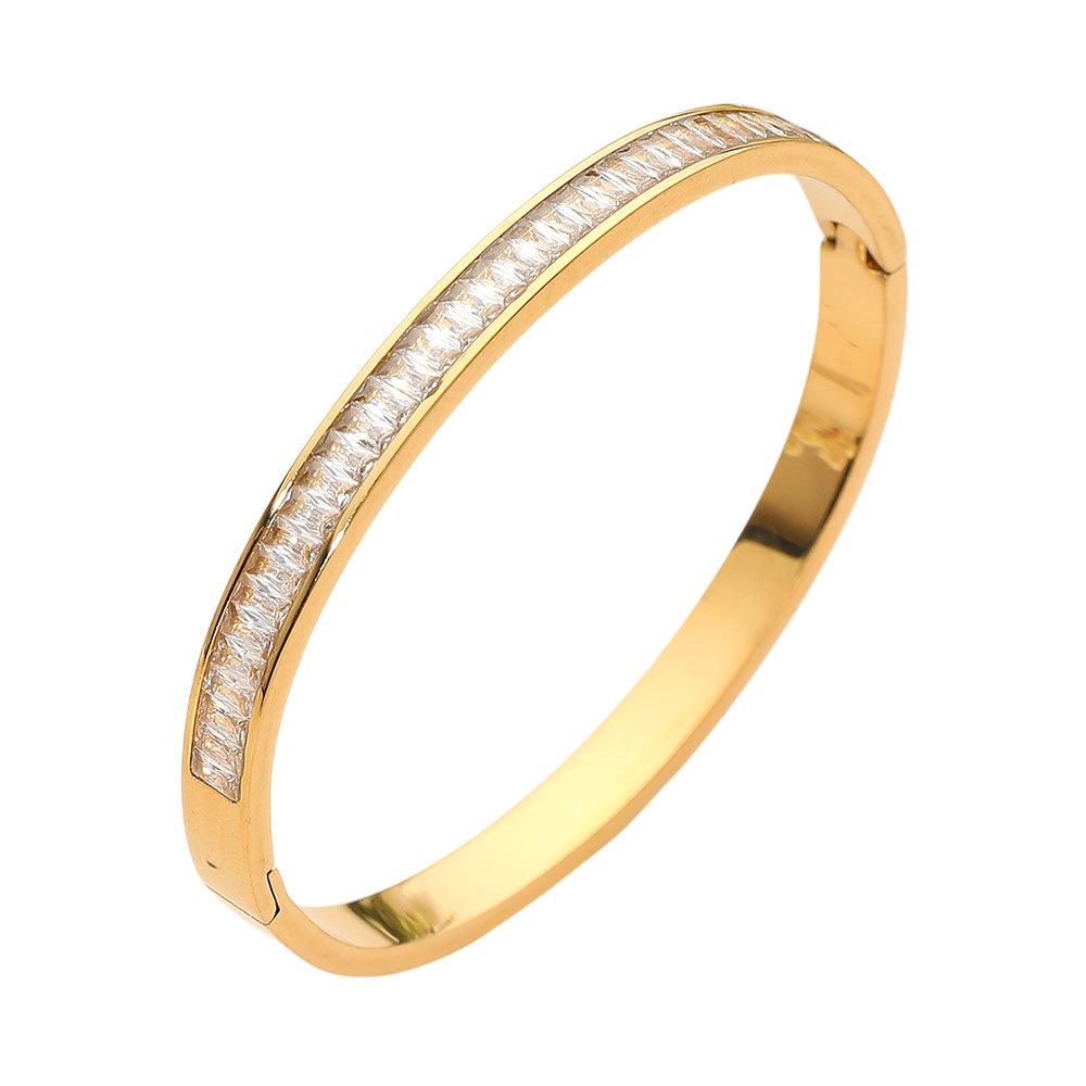 • Sleek hinge bangle bracelet featuring a refined row of crystal accents set along a polished silhouette for subtle sparkle and modern elegance. Designed for effortless wear, it elevates everyday outfits or completes evening looks with a timeless, sophisticated statement.