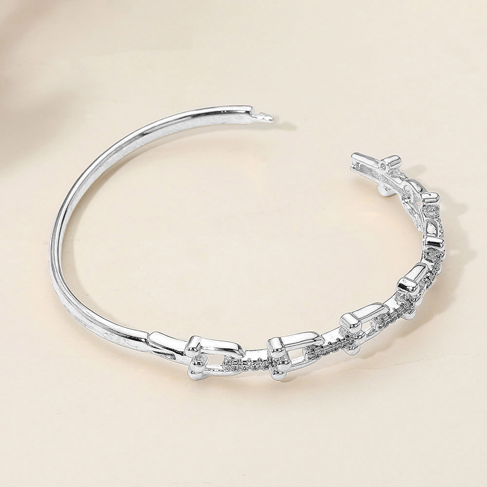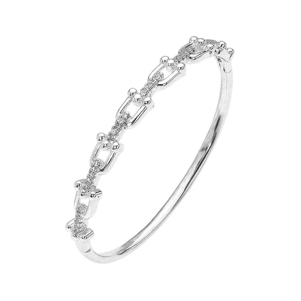 • Elegant bangle bracelet featuring interlinked geometric motifs accented with sparkling crystals. A refined and contemporary design that adds sophistication to any look, perfect for both casual and formal occasions.