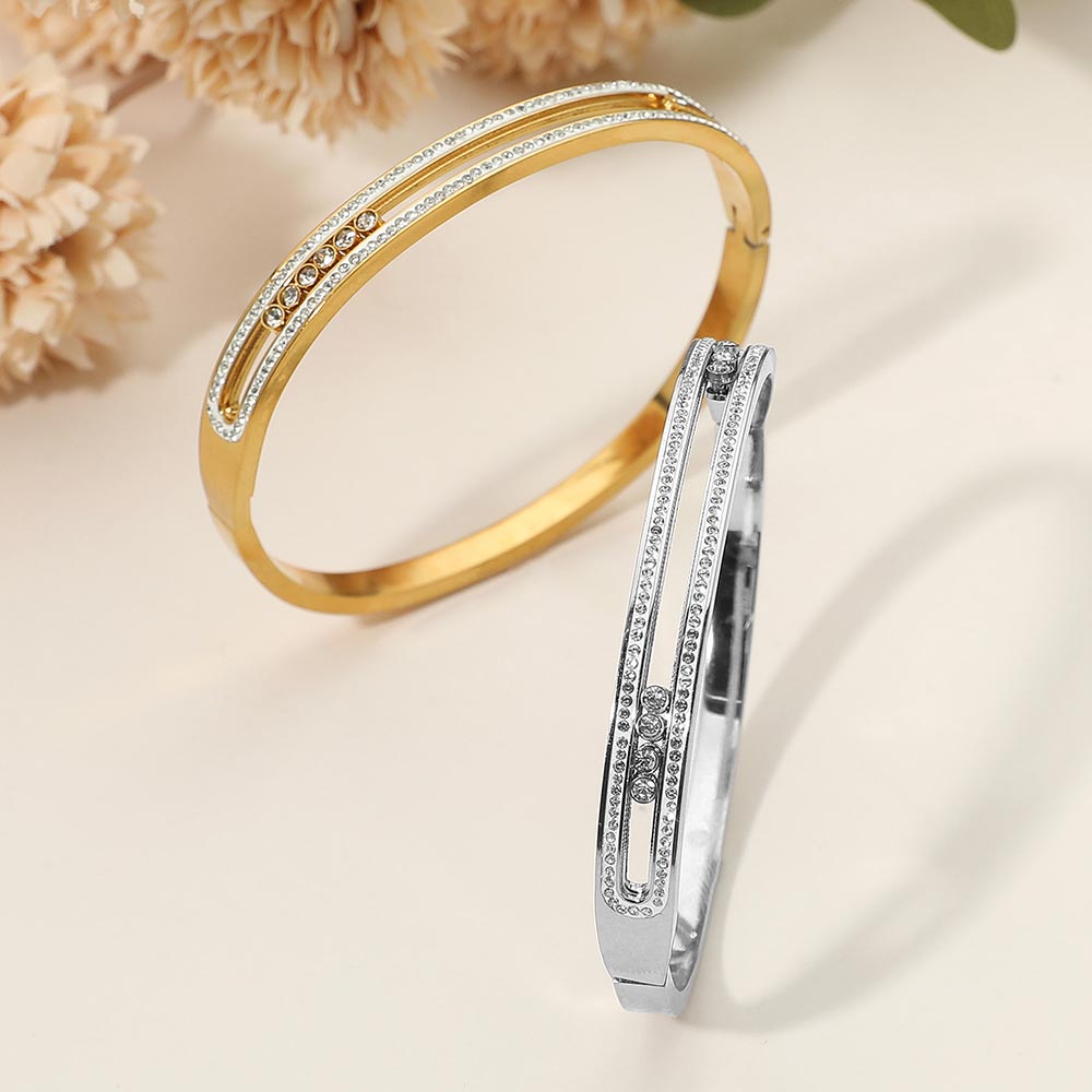Details • Size : 0.25" H, 2.4" D • Hinged Closure • Water Resistant • Sleek and sophisticated bangle bracelet featuring shimmering crystal accents and a polished design. A timeless accessory that adds a refined sparkle, perfect for formal events, evening wear, or everyday elegance. • Hypoallergenic • Stainless Steel