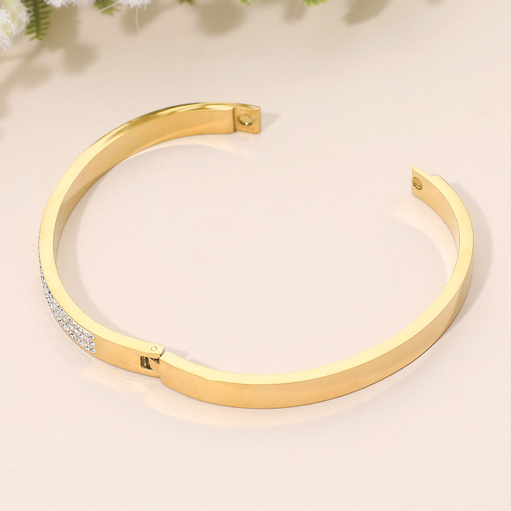 Details • Size : 0.25" H, 2.3" D • Hinged Closure • Water Resistant • Sophisticated hinge bangle bracelet featuring three rows of delicate crystal accents set into a sleek polished silhouette for radiant sparkle and refined style. Designed for effortless wear, it transitions seamlessly from everyday outfits to evening looks, adding timeless elegance when worn alone or layered. • Hypoallergenic • Stainless Steel