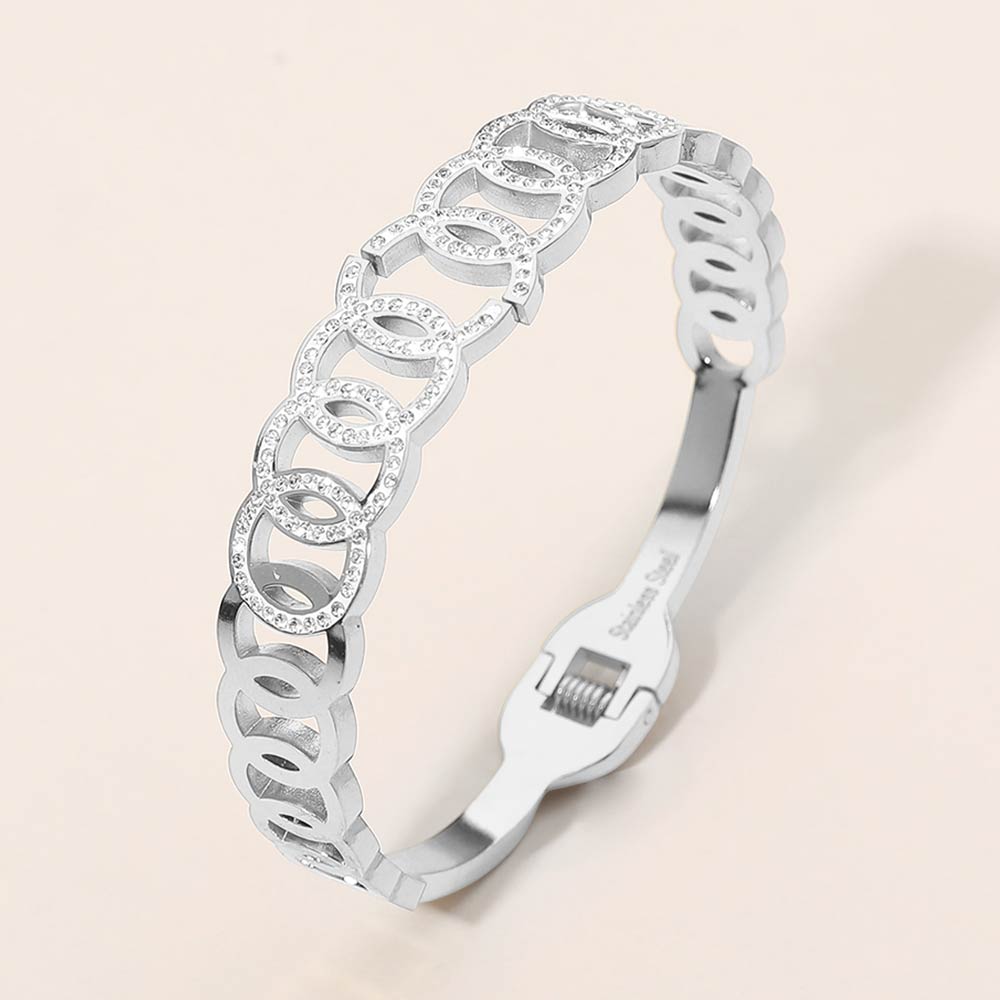 Details • Size : 0.5" H, 2.3" D • Hinged Closure • Sophisticated hinged bracelet designed with layered circle link shapes and sparkling cz accents. This sleek statement piece offers a polished look with easy wear, making it perfect for daily styling, evening outfits, or stacking with other bracelets for a refined, modern finish. • CZ Cubic Zirconia • Stainless Steel