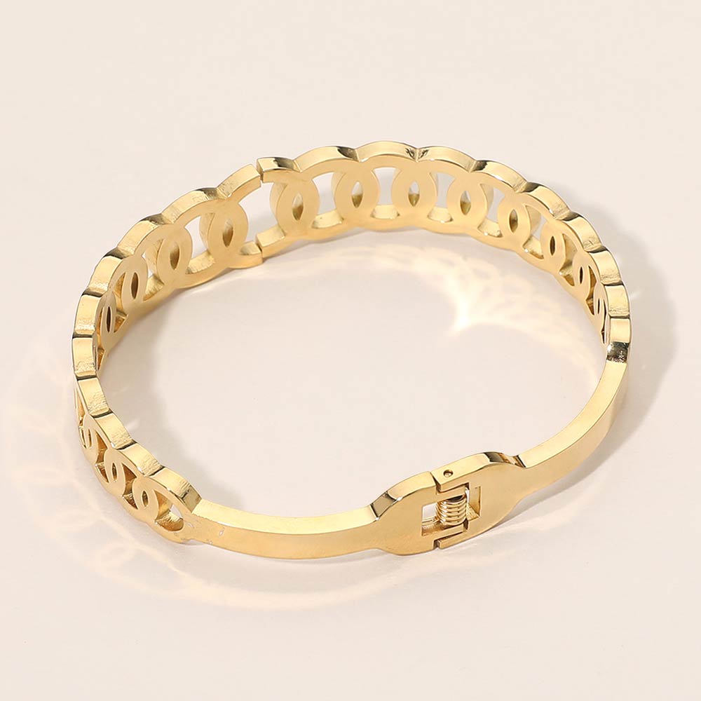 Details • Size : 0.5" H, 2.3" D • Hinged Closure • Sophisticated hinged bracelet designed with layered circle link shapes and sparkling cz accents. This sleek statement piece offers a polished look with easy wear, making it perfect for daily styling, evening outfits, or stacking with other bracelets for a refined, modern finish. • CZ Cubic Zirconia • Stainless Steel
