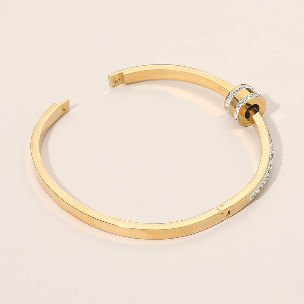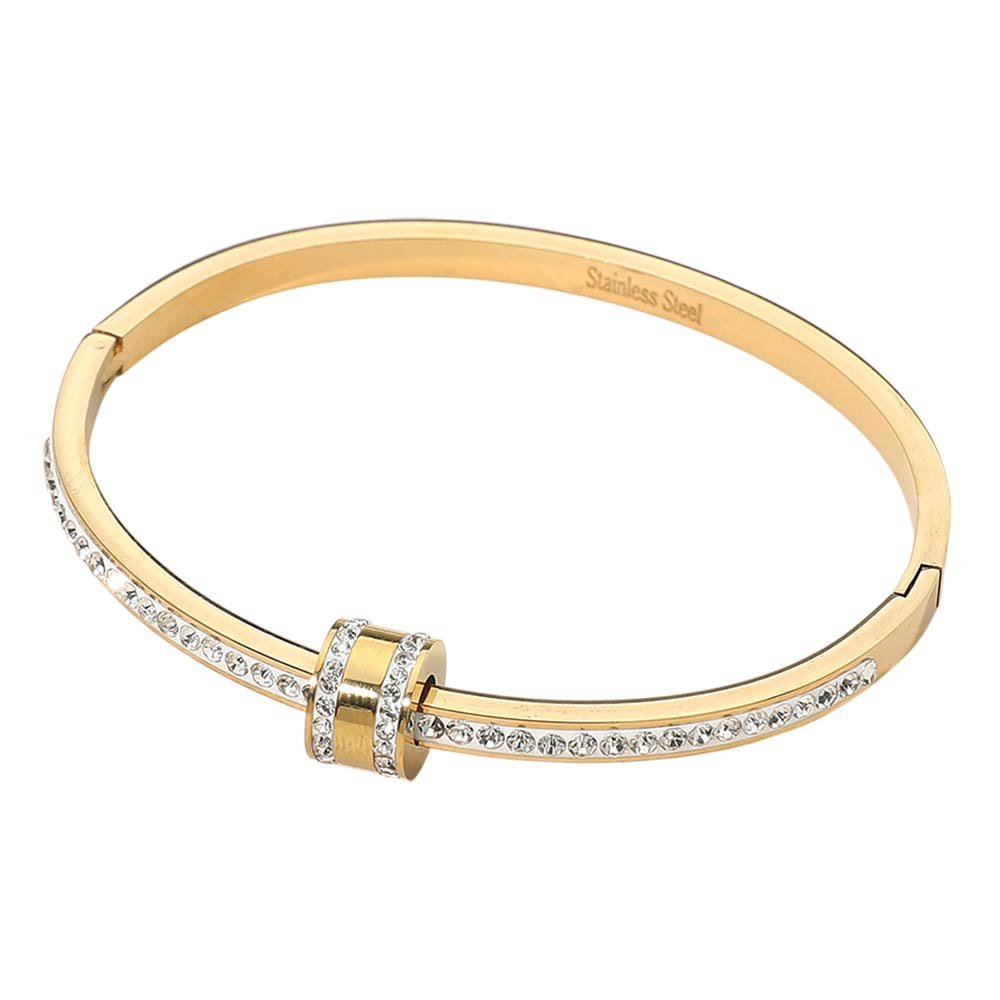 Details • Size : 0.4" H, 2.4" D • Hinged Closure • Sleek hinged bangle bracelet featuring a modern cz accent detail for a refined, polished look. Designed for easy wear and secure closure, this bracelet adds subtle sparkle and effortless elegance to everyday outfits, workwear, or evening styling. • CZ Cubic Zirconia • Stainless Steel