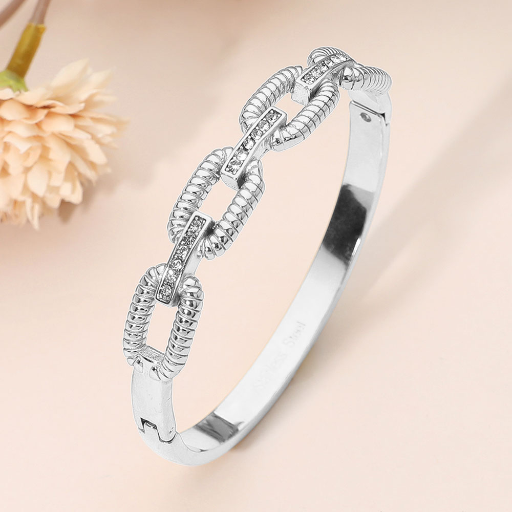 Details • Size : 0.4" H, 2.3" D • Hinged Closure • Statement bangle designed with bold interlocking link details and subtle accent sparkle for a sophisticated, modern finish. Easy to wear and comfortable for daily styling, perfect for stacking or as a standout solo piece to elevate casual and dress outfits alike. • CZ Cubic Zirconia • Stainless Steel