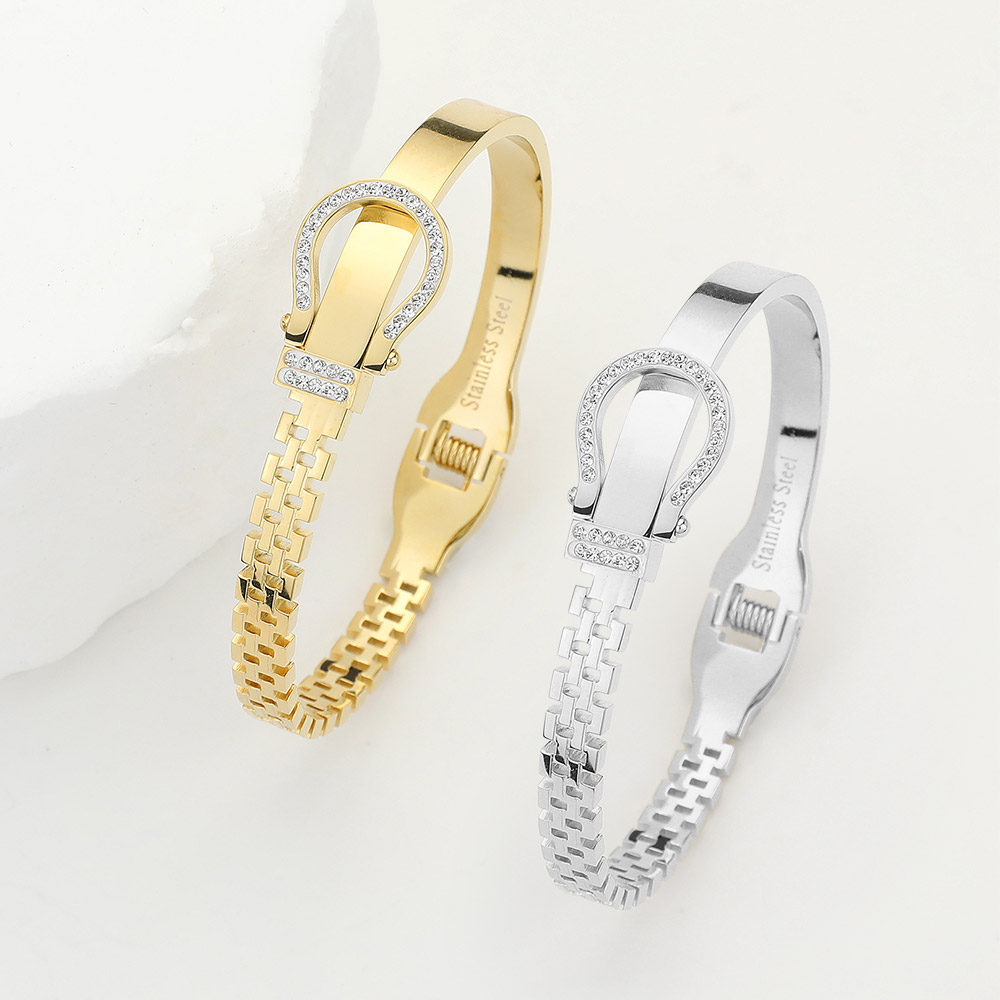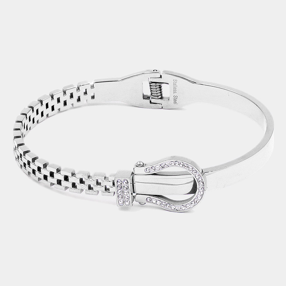• Add a refined touch to your look with this elegant bracelet featuring a sleek buckle-inspired design and shimmering accents. Perfect for both casual and formal wear, it combines timeless sophistication with contemporary charm, making it an ideal gift or everyday statement piece.