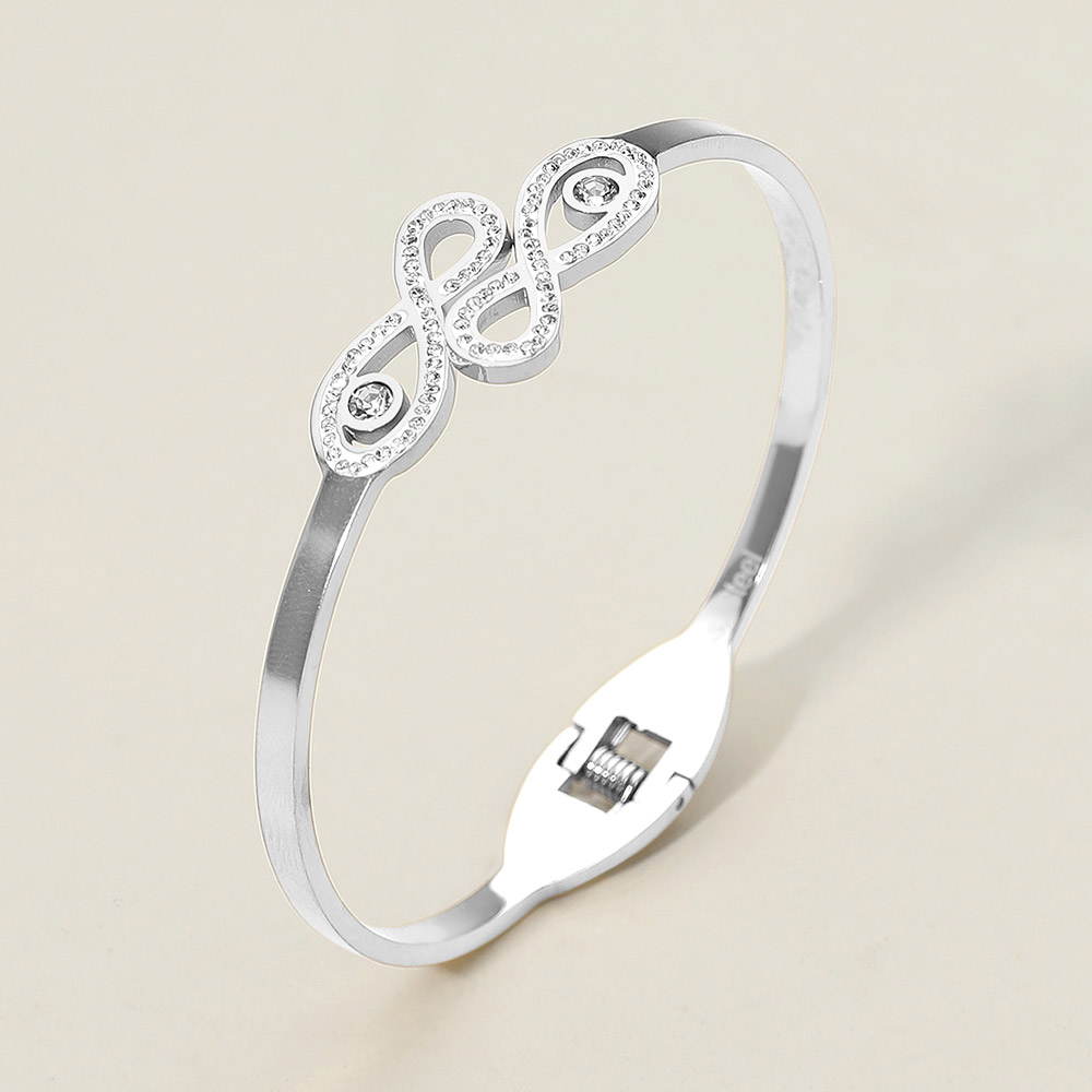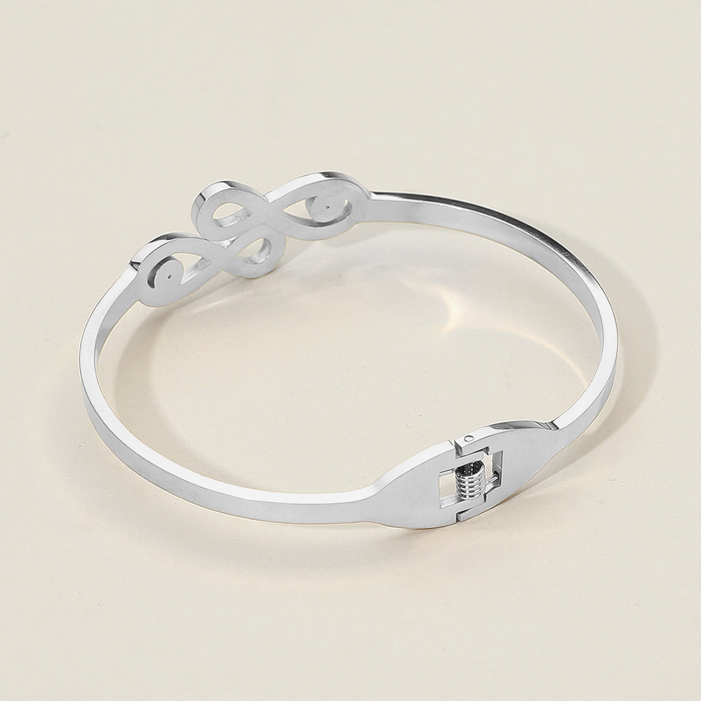 • Elegant bangle bracelet featuring a sleek infinity loop design with sparkling accents. Its modern clasp closure ensures a secure and comfortable fit, making it a perfect accessory for adding a touch of sophistication to everyday outfits or special occasions.