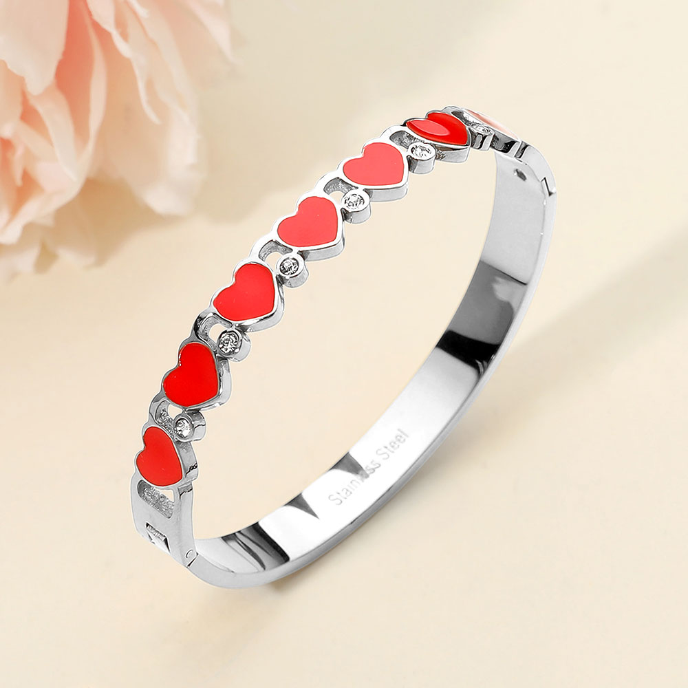 Stainless Steel Enamel Heart CZ Stone Hinged Bangle Bracelet