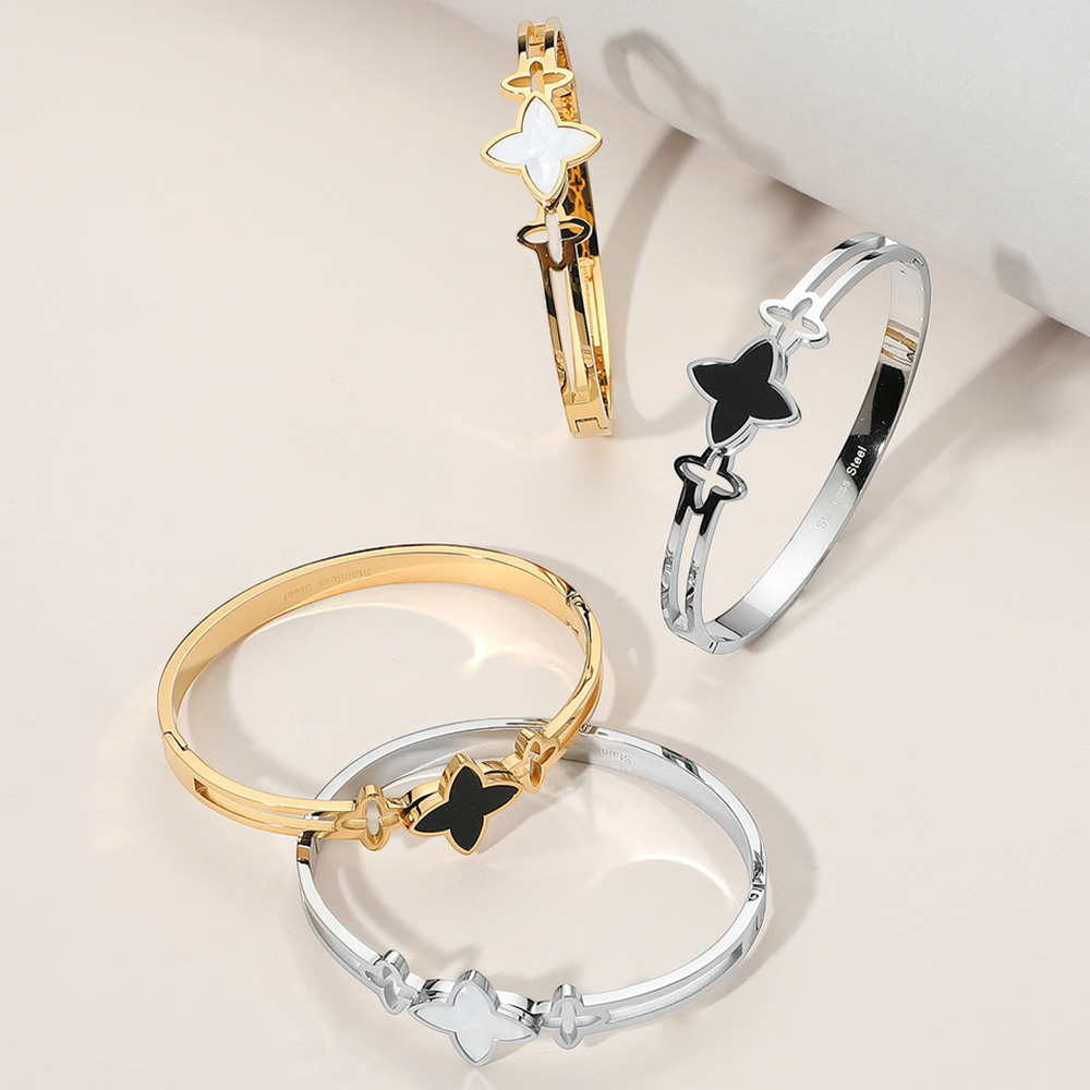 Details • Size : 0.7" H, 2.3" D • Hinged Closure • This modern clover motif bangle bracelet features a sleek openwork design with delicate cutout accents. Its unique style blends sophistication and charm, making it the perfect accessory for elevating both casual and formal looks. A versatile piece that adds elegance to any collection. • Stainless Steel