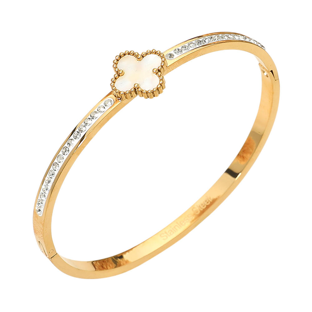 Details • Size : 0.5" H, 2.4" D • Hinged Closure • Enhance your jewelry collection with this quatrefoil hinged bangle bracelet. Featuring a delicate clover centerpiece and sparkling crystals along the band, this elegant accessory offers timeless charm and versatile sophistication for any occasion. • Stainless Steel