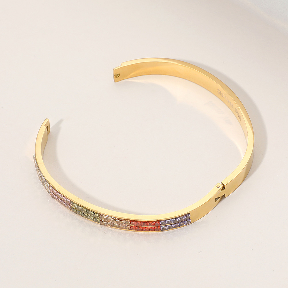 Details • Size : 0.25" H, 2.3" D • Hinged Closure • Sleek stainless steel bangle bracelet featuring a double row of square-cut crystals. A refined, modern accessory perfect for stacking or wearing solo. Durable and stylish for everyday wear. • Stainless Steel