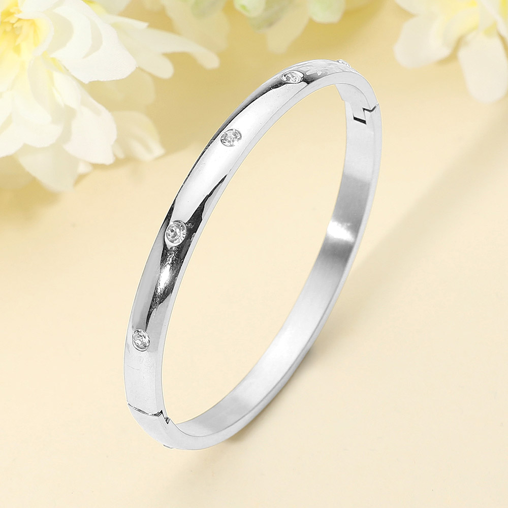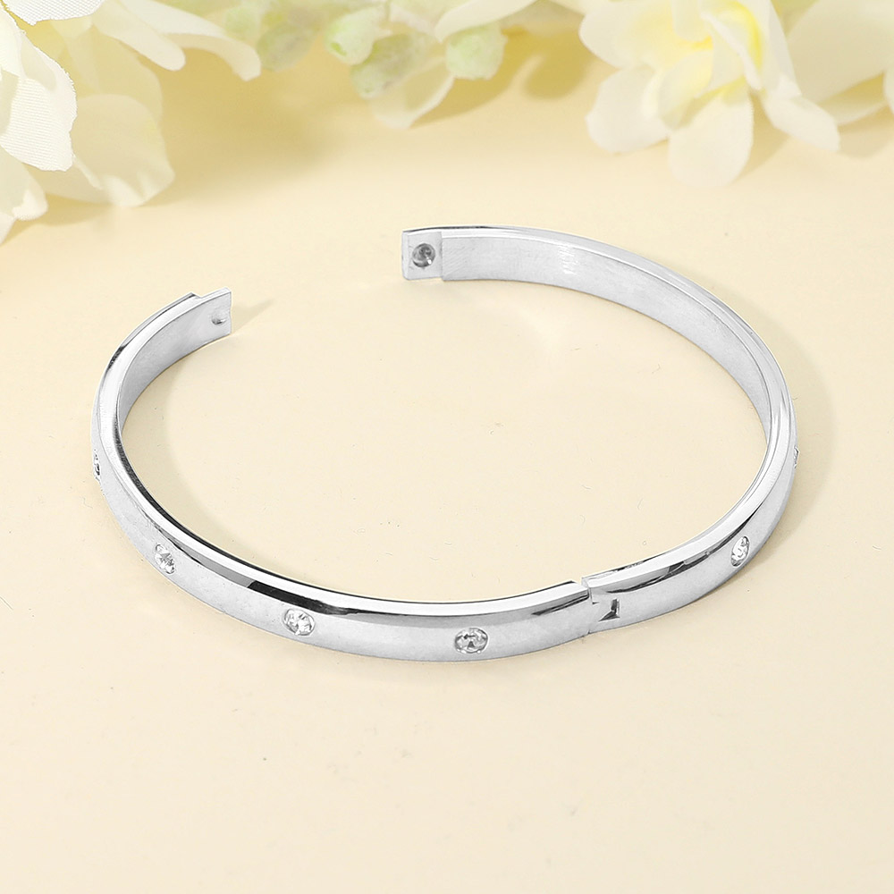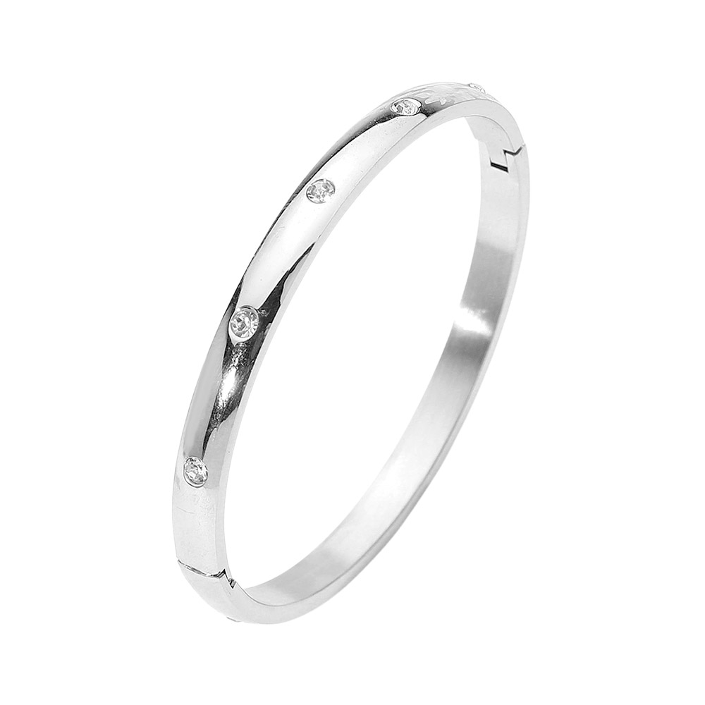 Details • Size : 0.25" H, 2.5" D • Hinged Closure • This stainless steel bangle features a sleek, polished surface adorned with shimmering crystal accents for a refined touch. Its timeless, minimalist design offers both elegance and versatility, making it a perfect accessory to complement day-to-night ensembles with effortless charm. • Stainless Steel