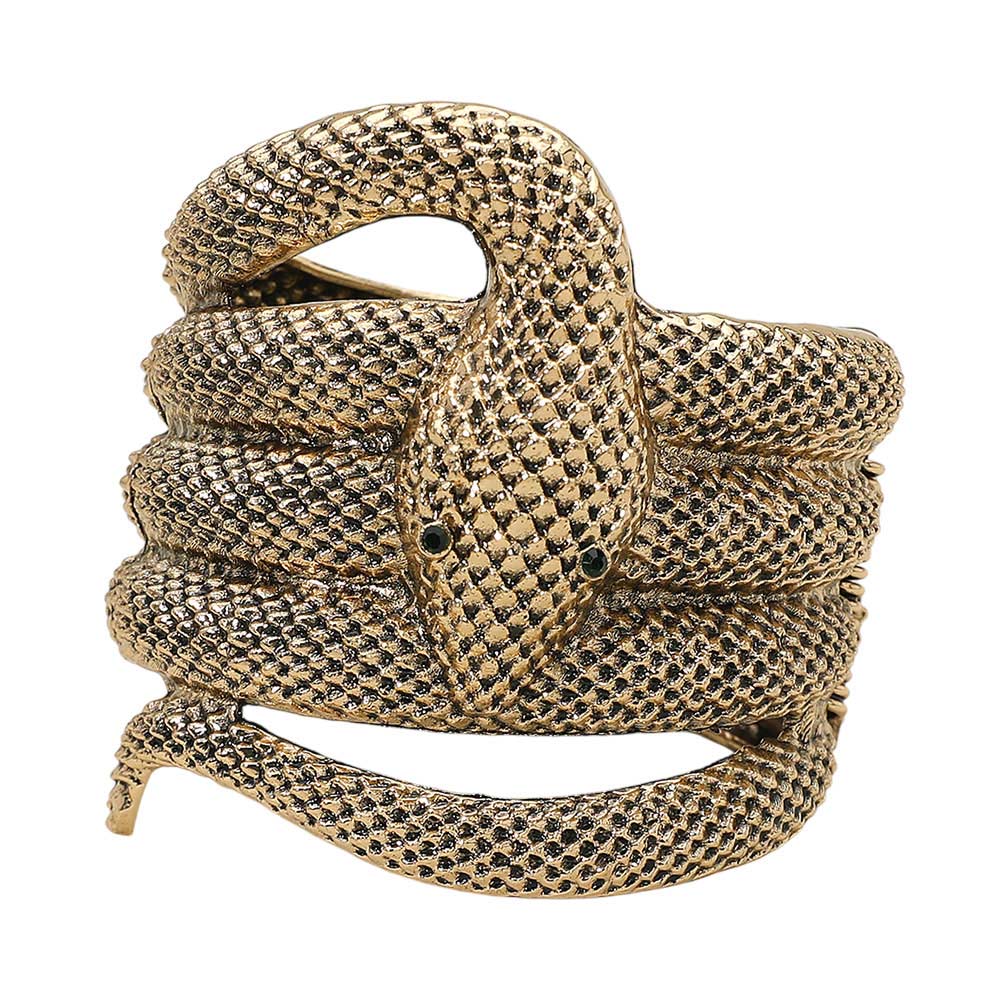 • Striking coiled snake bracelet featuring a detailed serpent wrap design with textured scales and bold sculptural form. This statement cuff adds a fierce, fashion-forward edge to any outfit, perfect for showcasing confidence and individuality in both casual and evening looks.
