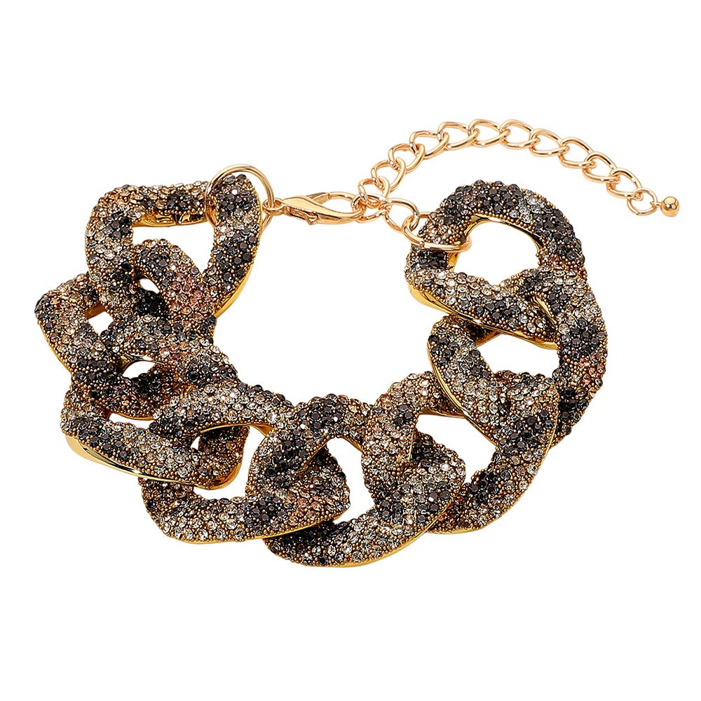 Details • Size : 1.25" H, 9" + 3" L • Lobster Closure • Elevate your wrist with the Chunky Rhinestone Link Bracelet, featuring bold interlocking links encrusted with shimmering crystals. This statement chain bracelet adds instant glamour and sophistication to any outfit, making it the perfect accessory for parties or elegant occasions. • Lead and Nickel Compliant