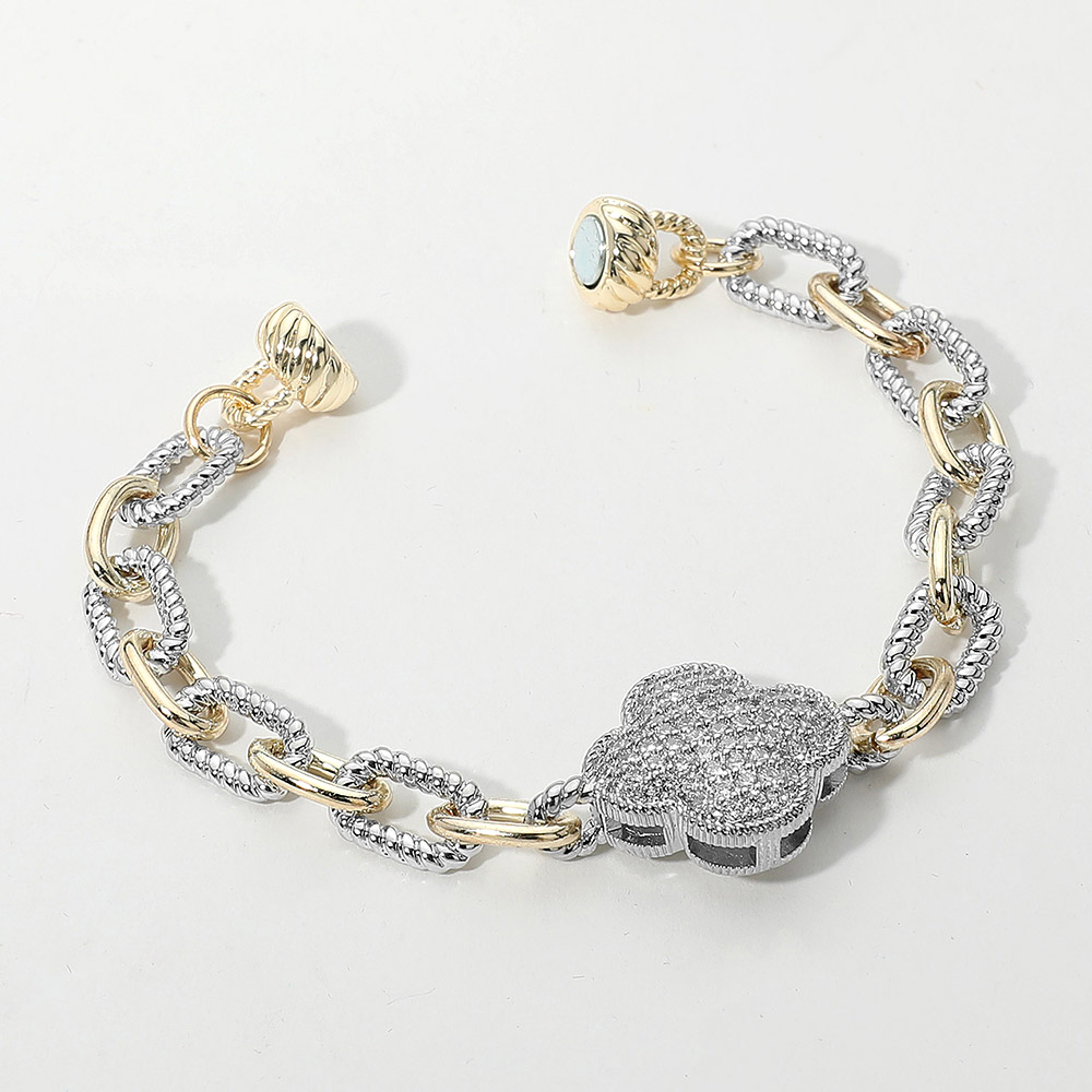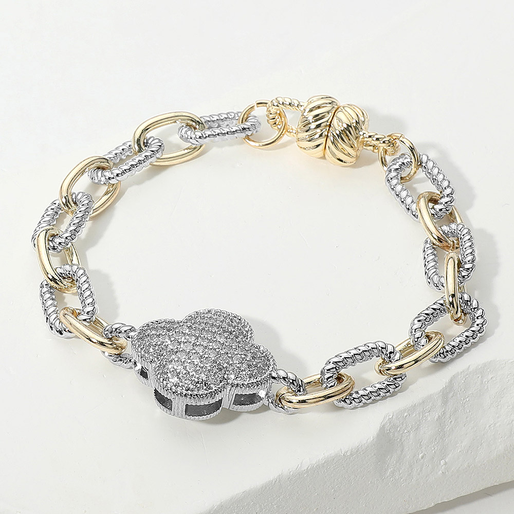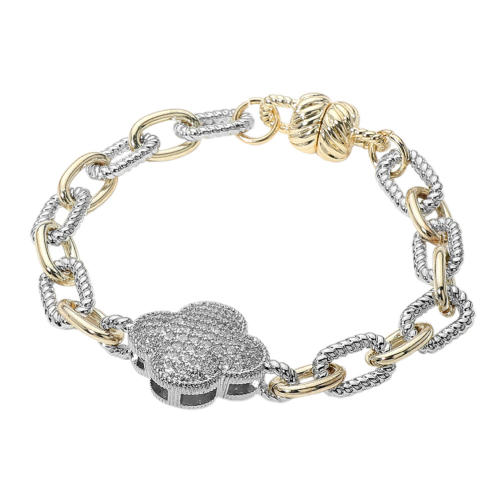 14K Gold Plated CZ Stone Paved Quatrefoil Charm Accent Two Tone Chain Magnetic Bracelet