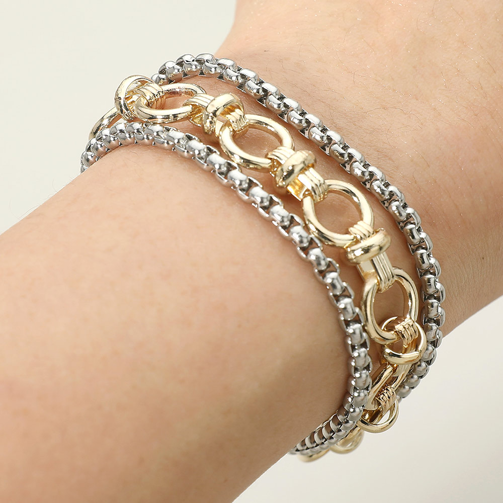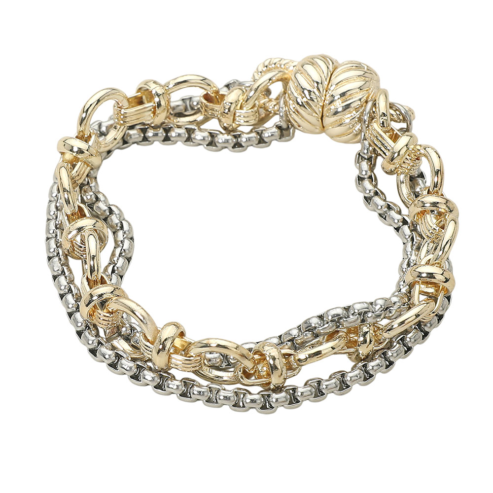 Details • Size : 0.7" H, 7" L • Magnetic Closure • Statement layered chain bracelet featuring a bold multi-link design with a secure magnetic closure for easy wear. Crafted for a modern stacked look, this versatile bracelet adds dimension and style to everyday outfits and trend-forward accessory collections. • Gold Dipped