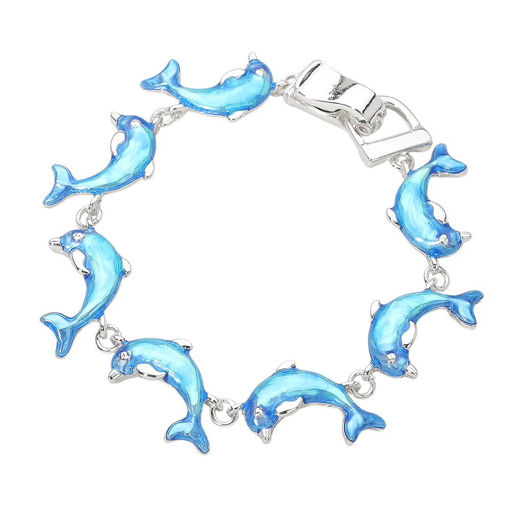 • Playful dolphin charm bracelet designed with smooth linked details and a secure magnetic closure for easy on and off wear. A fun ocean-inspired accessory ideal for beach shops, gift boutiques, and seasonal collections, offering everyday comfort with standout coastal style.