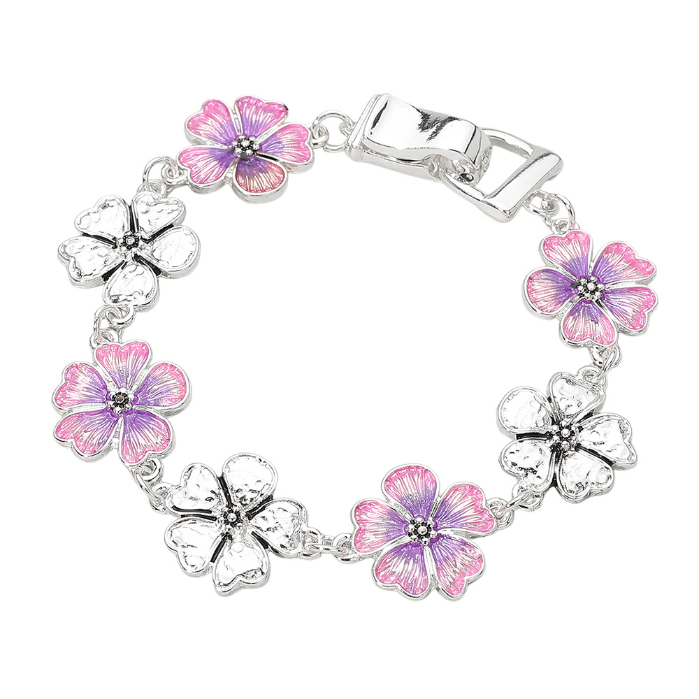 • Elegant floral charm bracelet featuring linked flower accents and a secure magnetic clasp. Designed with sculpted petal details and a polished finish, this bracelet adds a graceful touch to everyday outfits, gifting collections, and seasonal accessory assortments with effortless wear appeal.