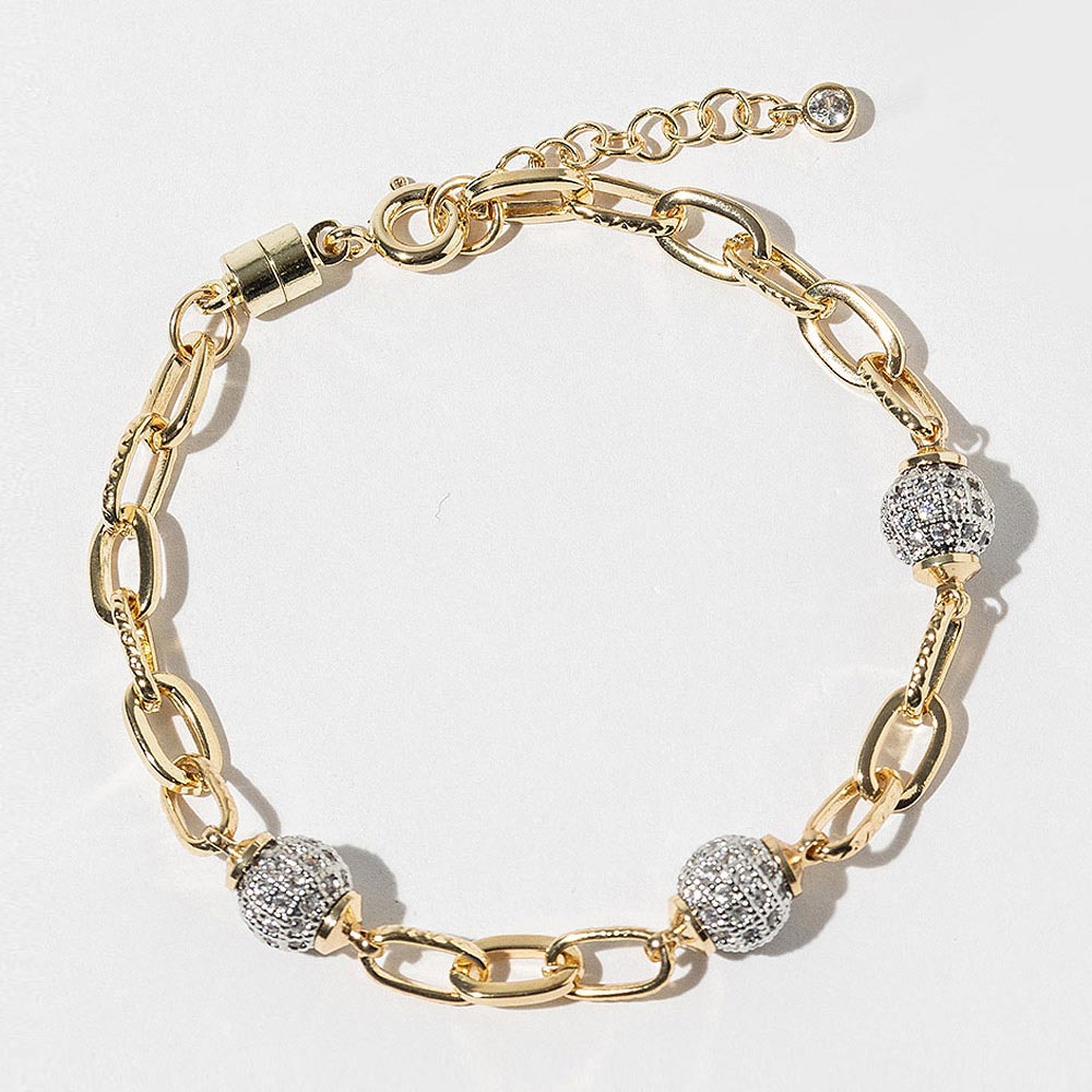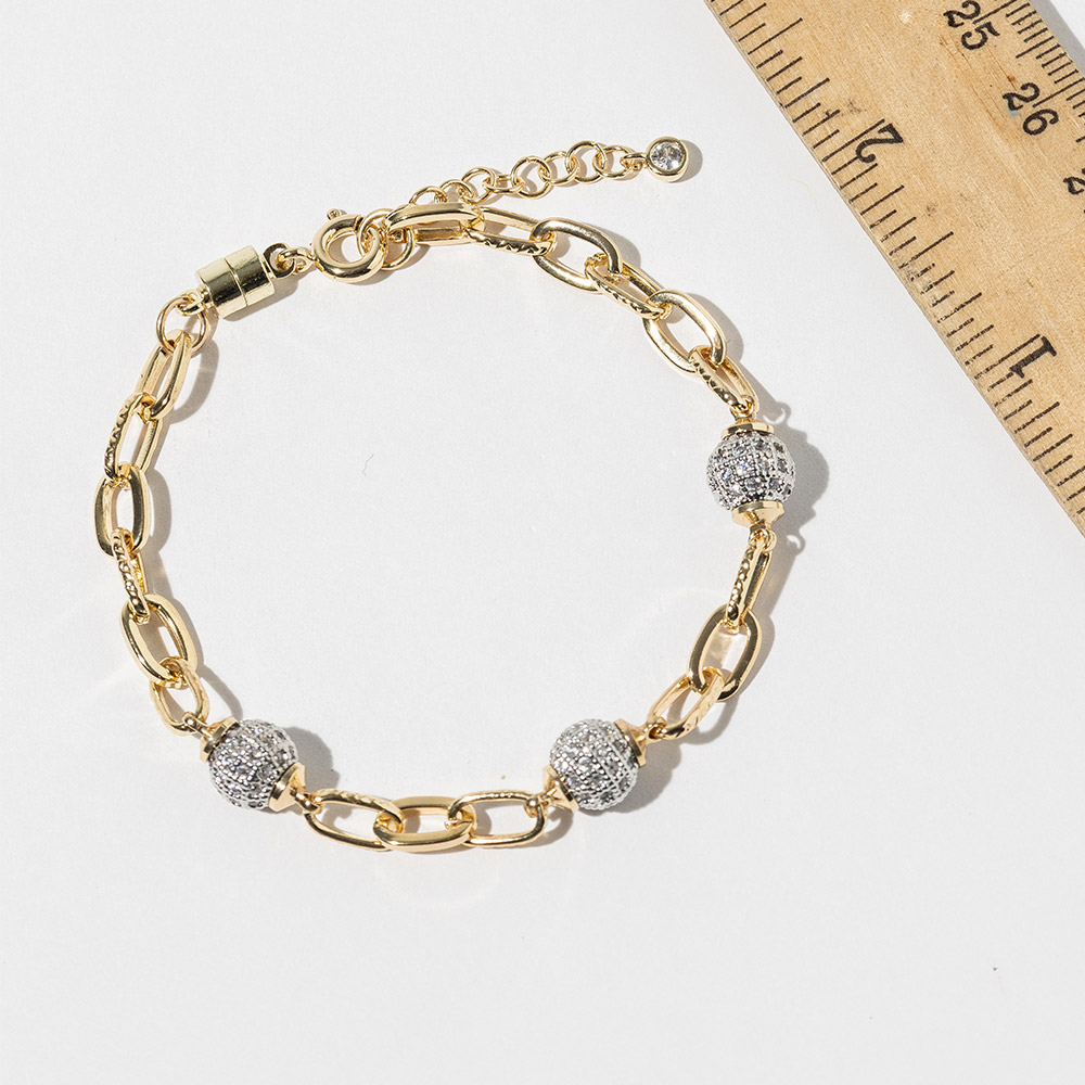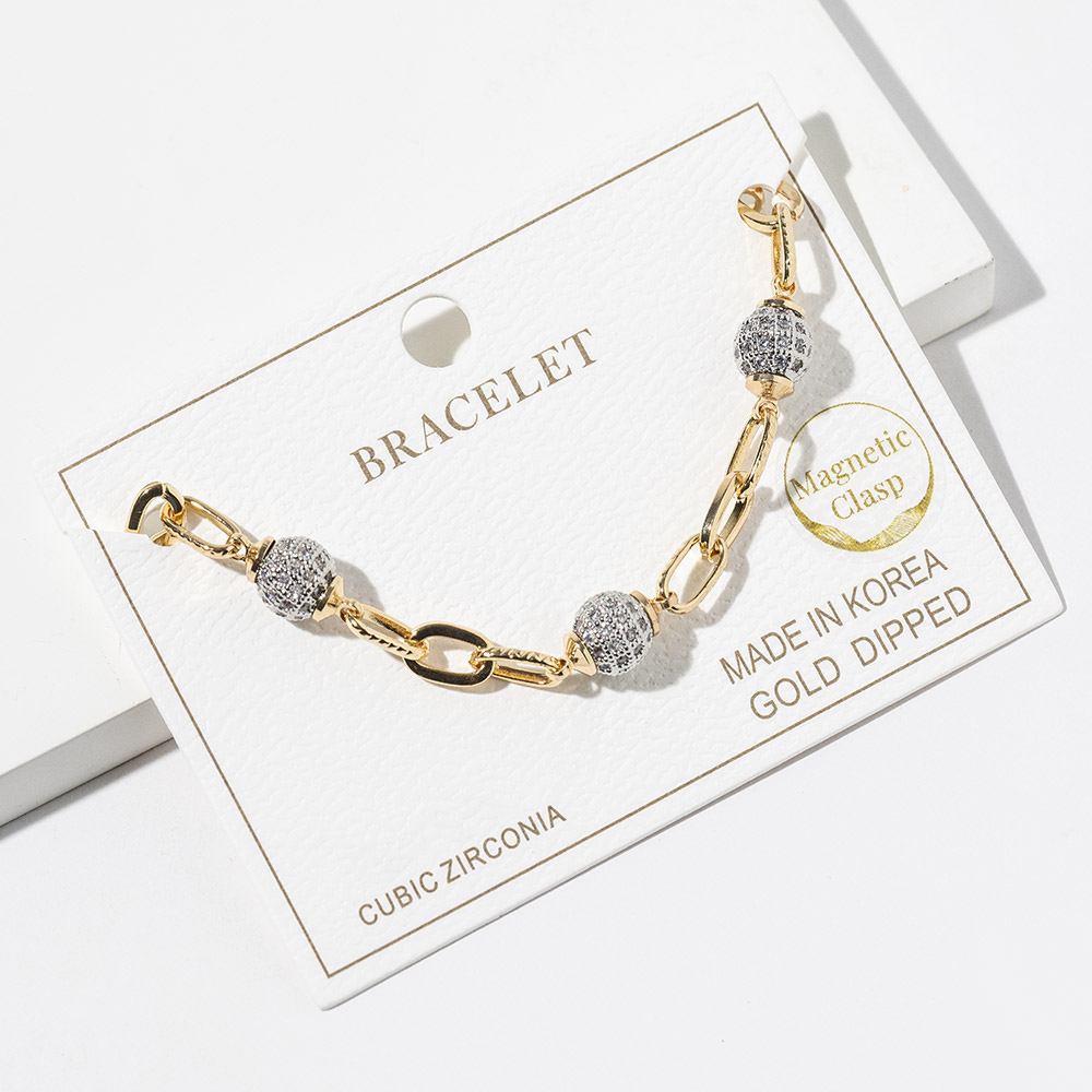 Details • Size : 0.3" H, 7" + 1" L • Magnetic Clasp Closure • Elevate any look with this elegant chain bracelet featuring a secure magnetic clasp and sparkling bead accents. Designed for effortless style, this accessory adds a refined shine to everyday wear or special occasions. A versatile piece that complements layered stacks and individual styling. • CZ Cubic Zirconia • Gold Dipped • Lead and Nickel Compliant • Made In Korea