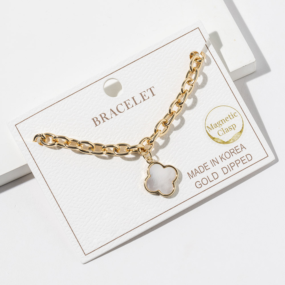 Gold Dipped Mother of Pearl Quatrefoil Charm Accent Chain Link Magnetic Bracelet