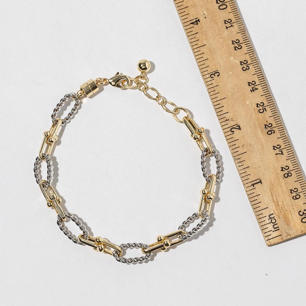 Details • Size : 0.3" H, 8" + 1" L • Magnetic Closure • Modern link bracelet designed with a convenient magnetic clasp for quick, secure wear. A clean, versatile style that works effortlessly for daily outfits or layered bracelet looks. Ideal for gifting, boutique collections, and customers who value both style and ease of use. • Gold Dipped • Lead and Nickel Compliant • Made In Korea