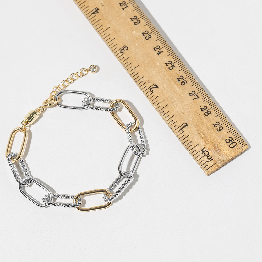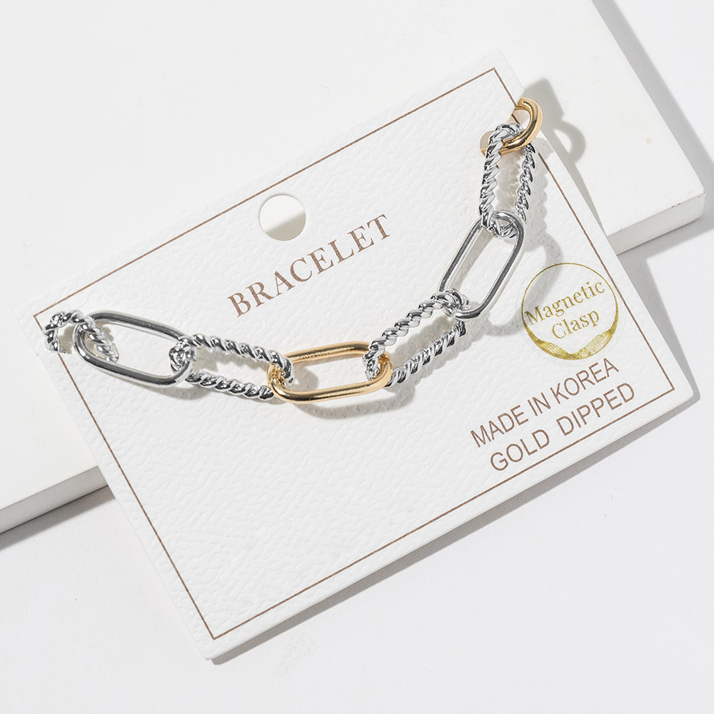Details • Size : 0.4" H, 7" + 1" L • Magnetic Clasp Closure • Elevate everyday style with this mixed chain link bracelet featuring a combination of smooth and twisted links, finished with a secure magnetic closure for effortless wear. Designed to add a modern touch to any outfit, this versatile accessory is ideal for stacking or wearing alone for a chic statement. • Gold Dipped • Lead and Nickel Compliant • Made In Korea