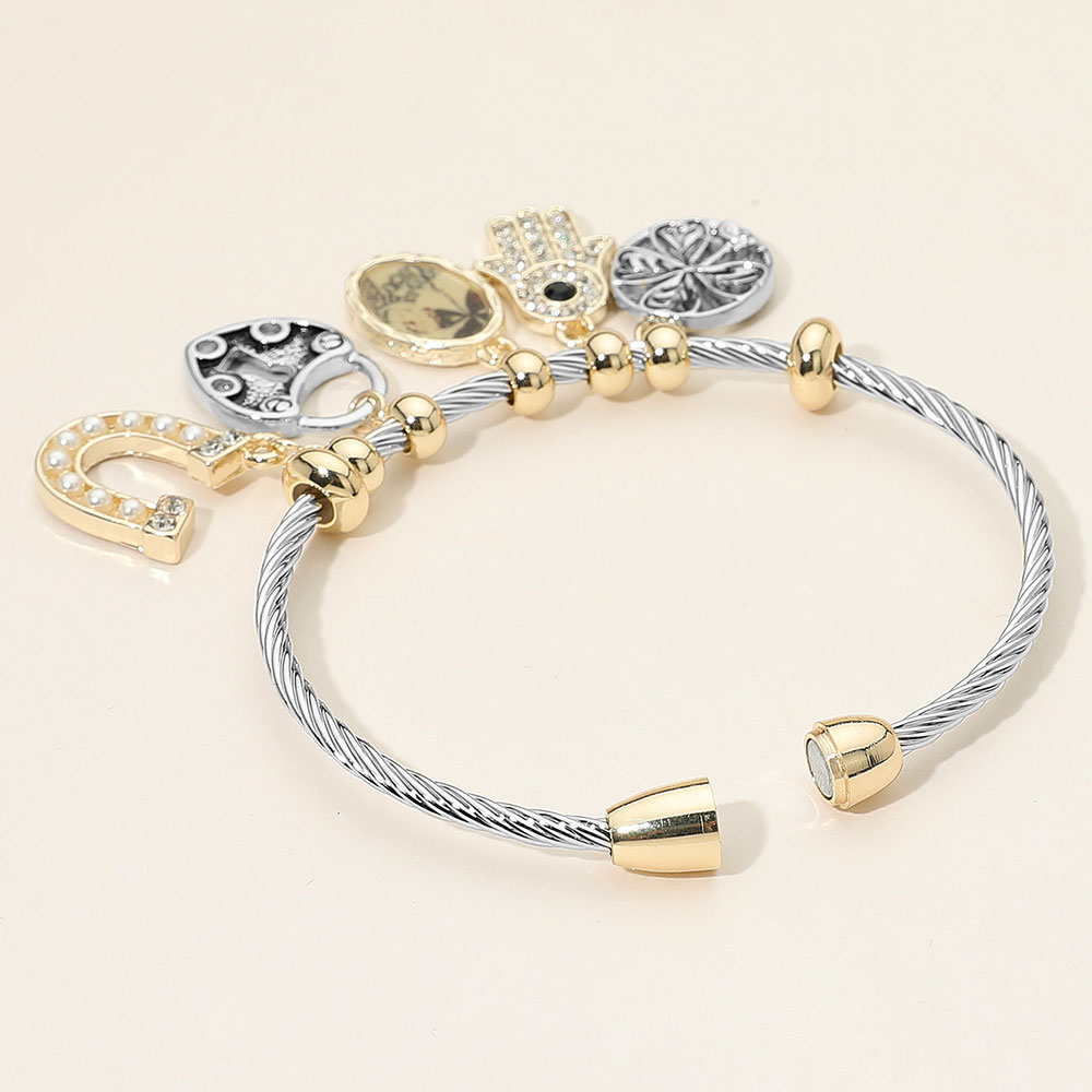 Details • Size : 0.1" H, 7" L • Charm Size : 1.2" L • Magnetic Closure • This stylish cable bracelet showcases an array of lucky charm pendants, each symbolizing positivity and protection. With its blend of textures and metallic finishes, it offers a unique balance of modern design and timeless symbolism, ideal for everyday elegance.