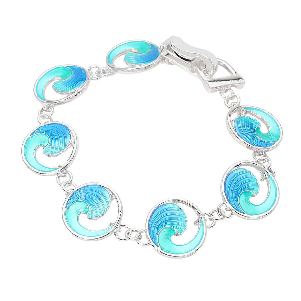 • Ocean wave link bracelet featuring circular wave-inspired charms connected in a fluid, coastal design. A great choice for beach boutiques, resort shops, cruise destinations, and summer-themed collections, offering an easy-to-style accessory with relaxed seaside appeal.