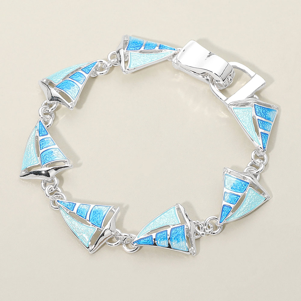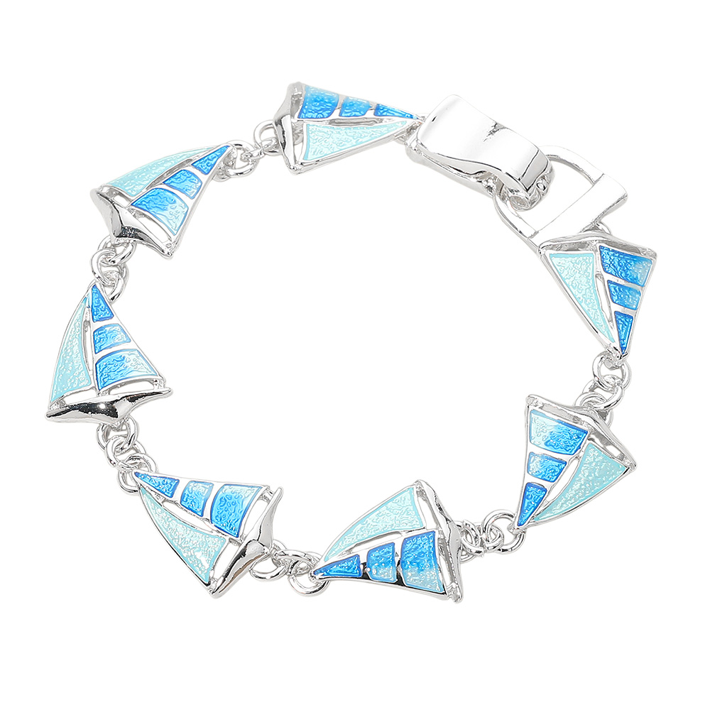 • Nautical sailboat charm bracelet designed with linked sail motifs that create a playful, seaside-inspired look. Ideal for beach boutiques, resort shops, cruise gift stores, and summer collections, this bracelet brings a breezy coastal feel to everyday wear and vacation-ready styling.