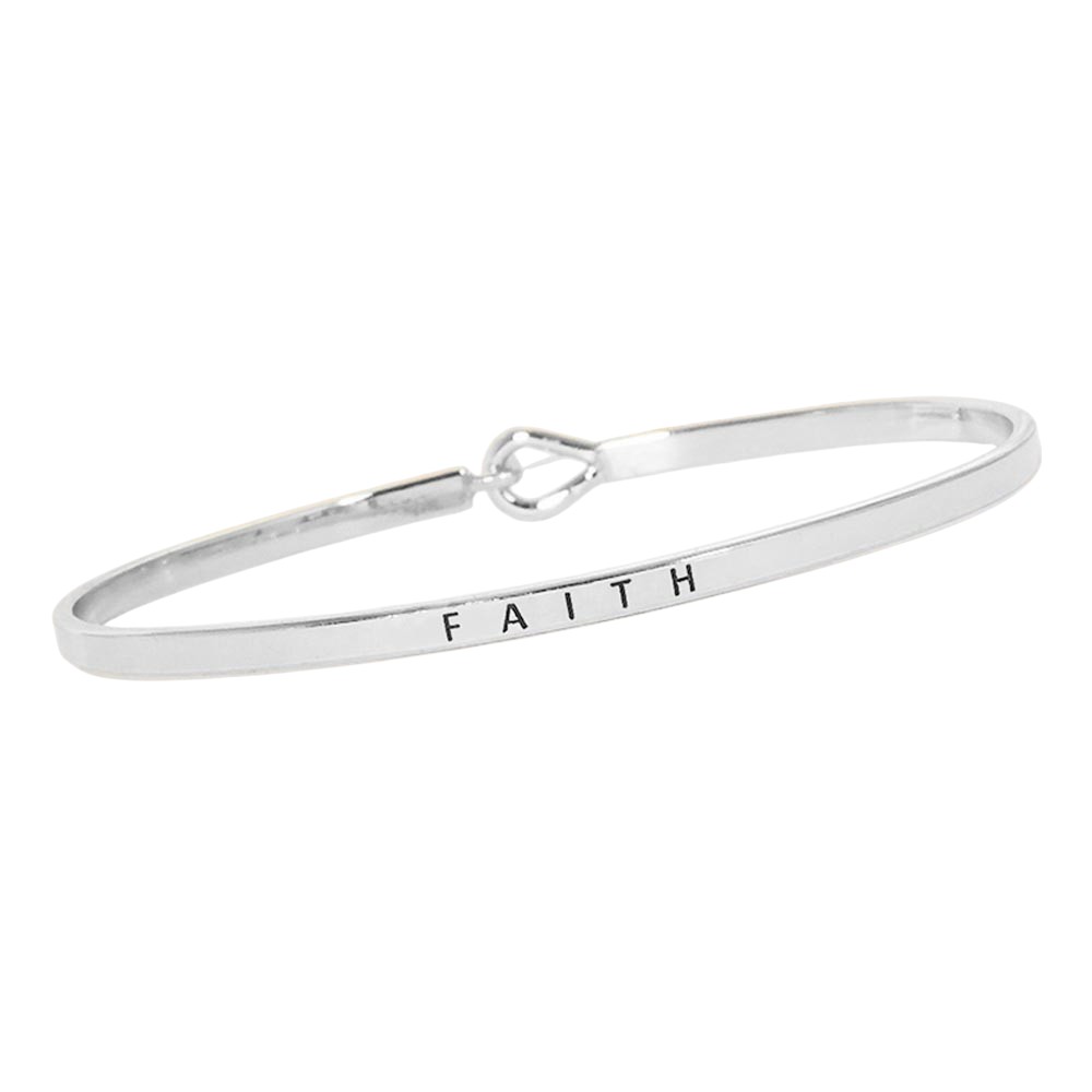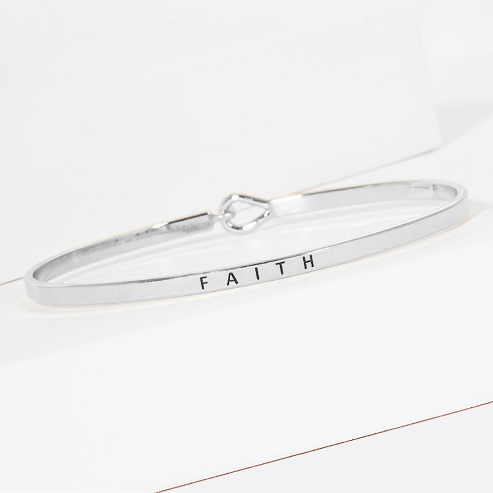 Details • Size : 0.2" H, 2.5" D • Hook Closure • This simple and elegant bangle bracelet features the word “Faith” engraved on a slim, polished band. Complete with a heart-shaped hook clasp, it’s a subtle yet powerful reminder of belief and strength. Ideal for layering or wearing alone as a meaningful daily accessory. • Lead and Nickel Compliant • Brass
