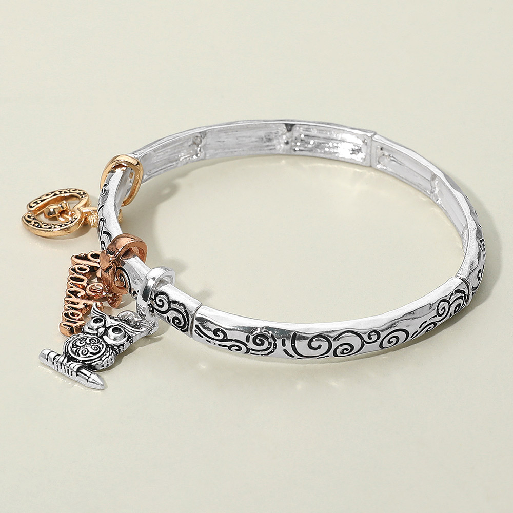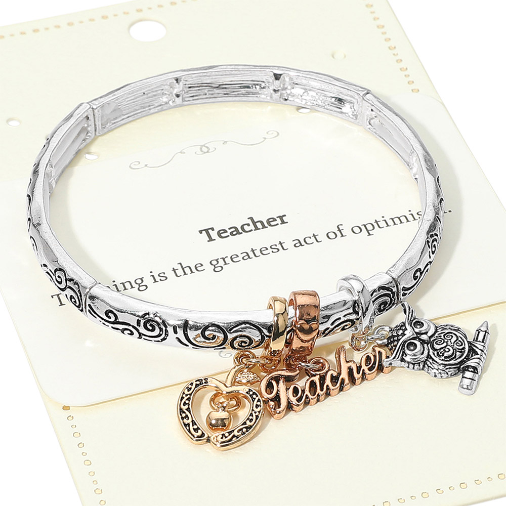 • Honor educators with this Teacher charm bracelet featuring a heartfelt inscription, intricate owl charm, and decorative heart pendant. A meaningful appreciation gift that celebrates teaching as a lasting act of inspiration.
