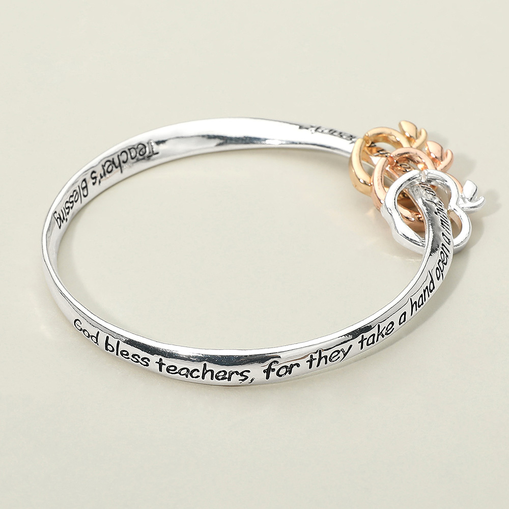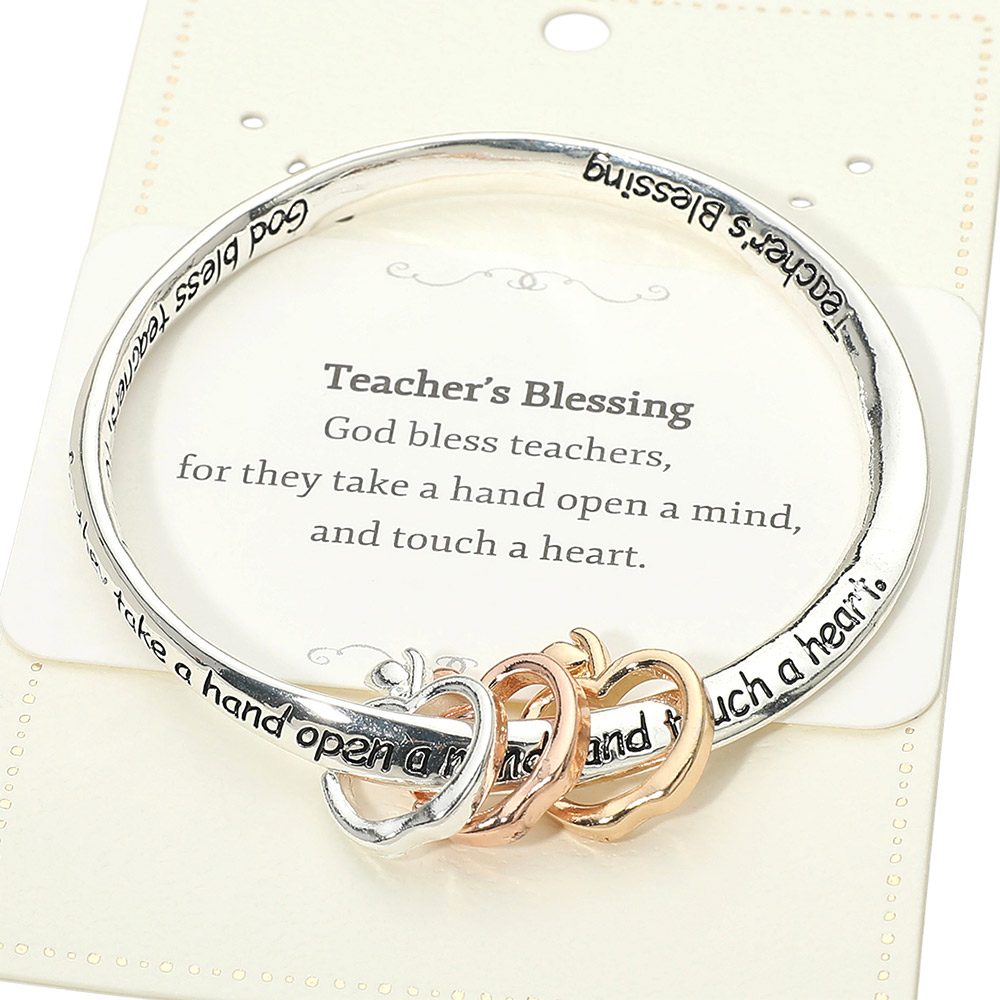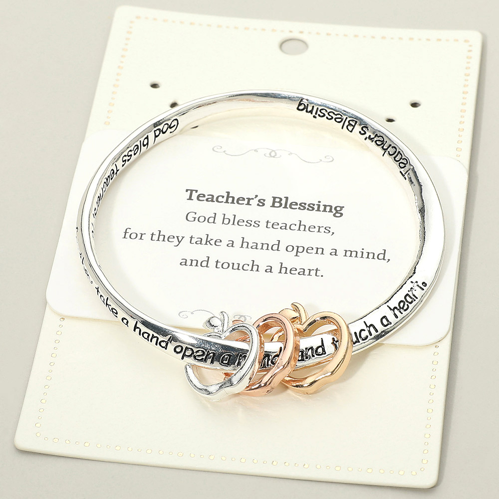 Details • Size : 0.75" H, 2.3" D • This teacher blessing bangle bracelet features an engraved inspirational message paired with interlocking heart accents for meaningful appeal. Designed to honor dedication and impact, it’s ideal for boutiques offering thoughtful appreciation gifts, sentiment jewelry, and keepsake accessories that celebrate educators in a heartfelt way. • Lead and Nickel Compliant