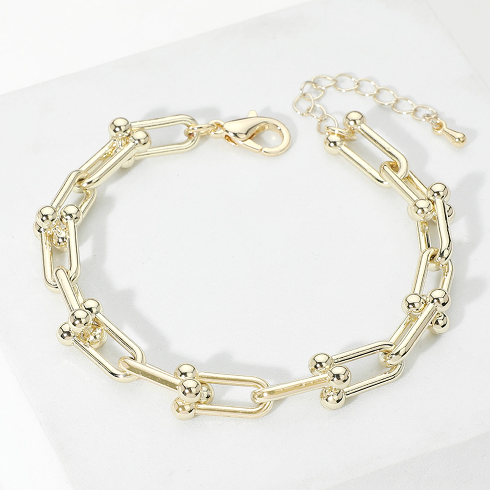 • Stylish link bracelet featuring elongated chain links accented with polished bead details for a modern, elevated look. Adjustable design ensures a comfortable fit, making it perfect for everyday wear or layering with other favorites. A chic accessory for any style.