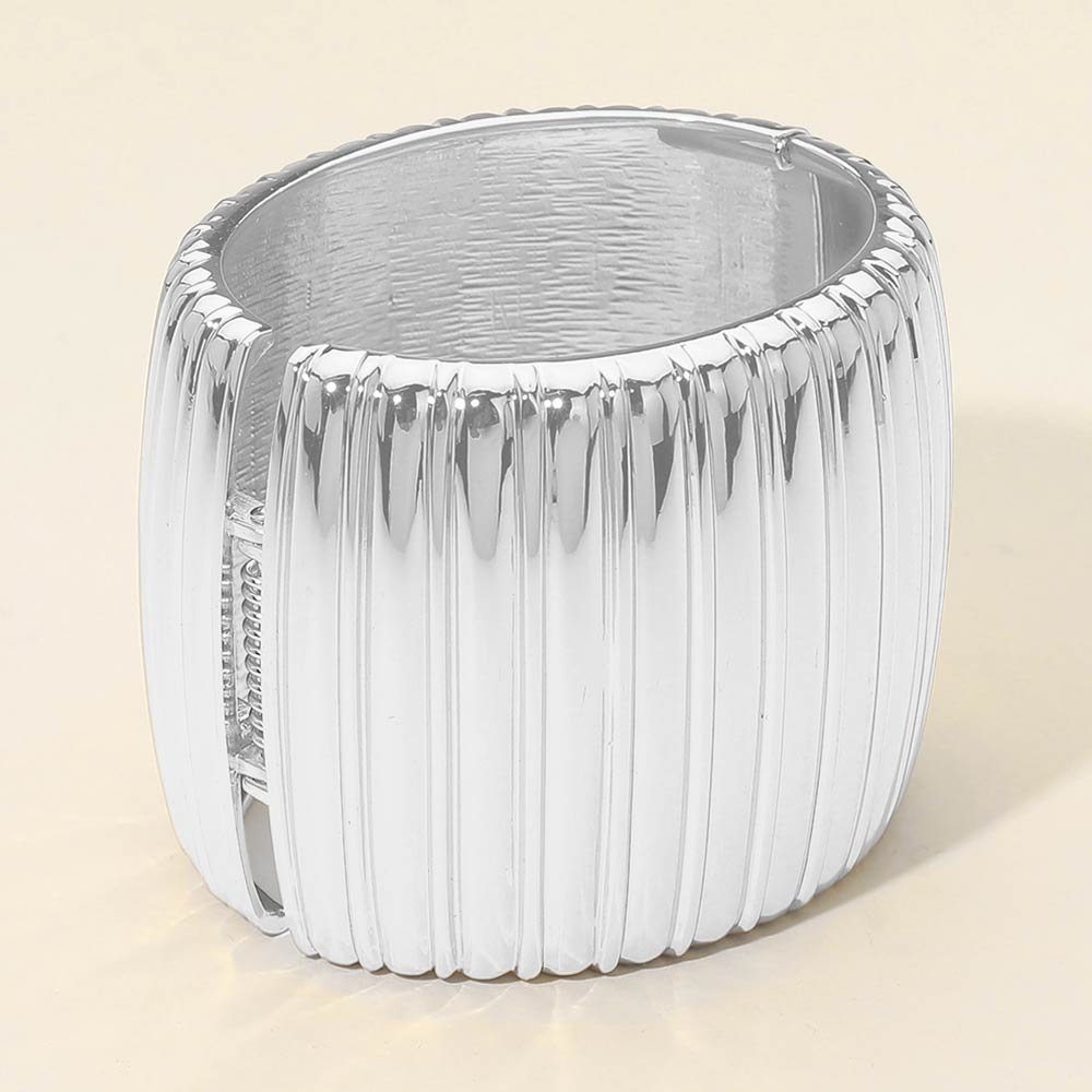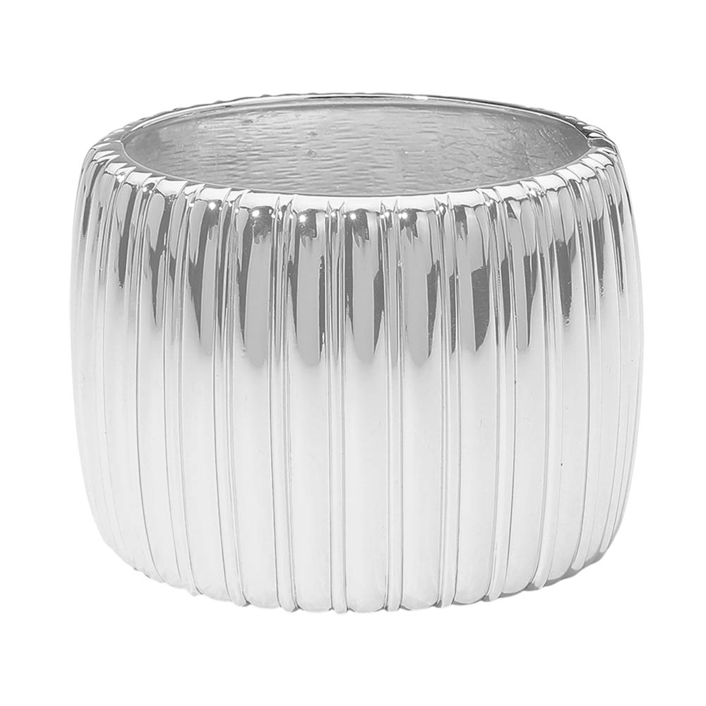 Details • Size : 2.25" H, 2.5" D • Hinged Closure • Bold statement band ring featuring a wide silhouette with ribbed texture for a structured, modern look. Designed to stand out worn solo or layered with other rings, this piece adds confident style and sculptural appeal to everyday outfits or elevated occasions. • Lead and Nickel Compliant